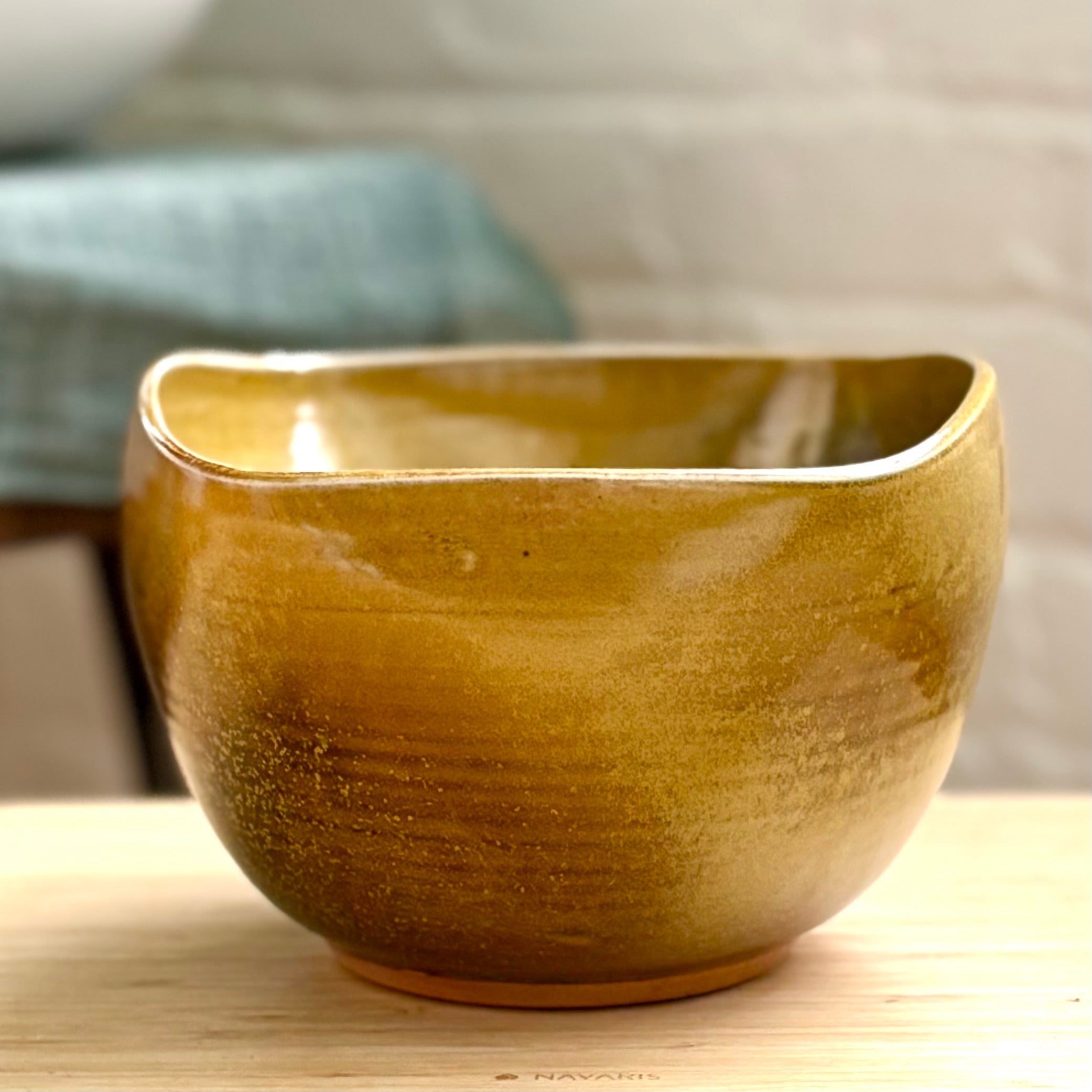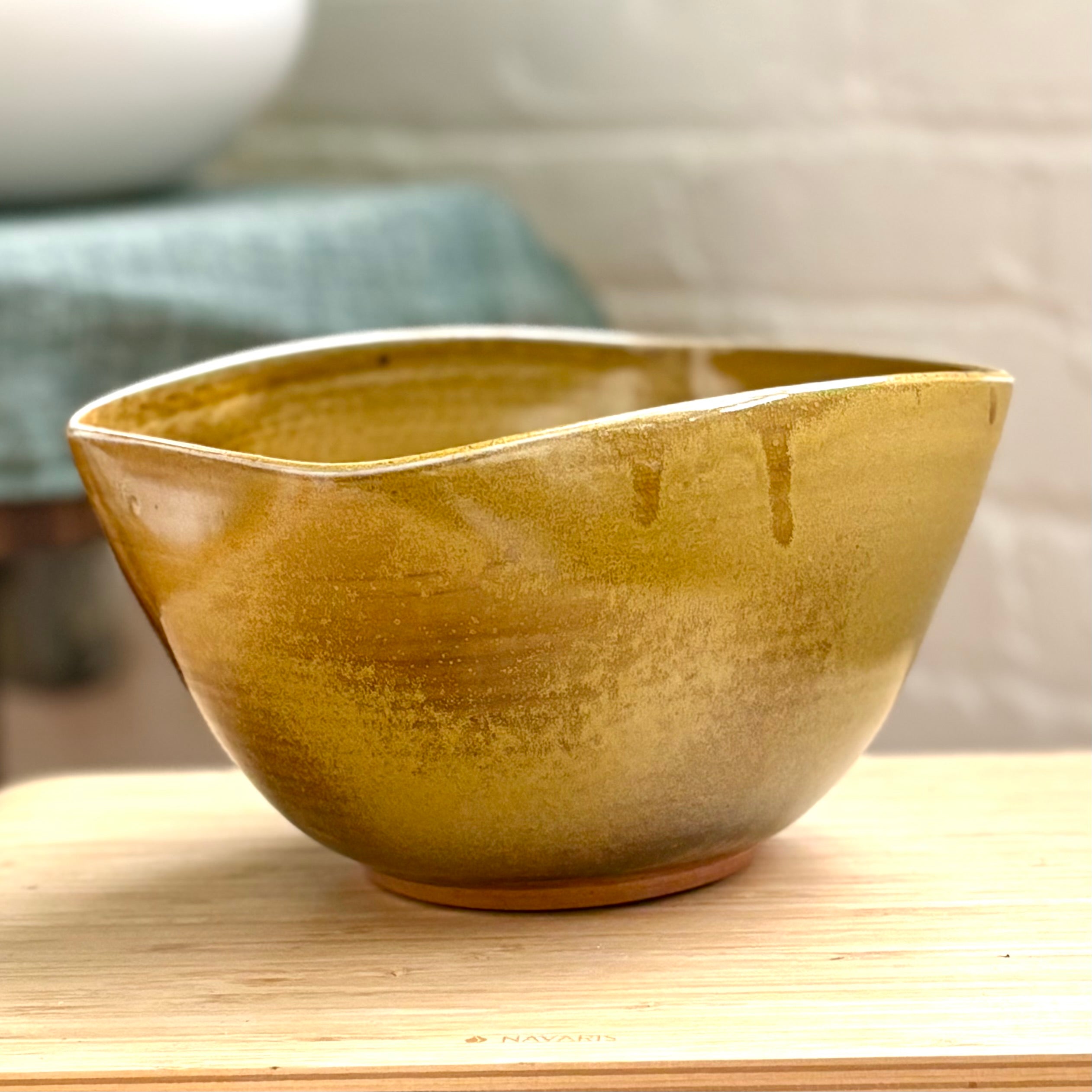 Guy Matsudaによる磁器製のサービングボウル。轆轤成形の後、縁にわずかな変形を加えて柔らかな長方形に仕上げられています。薪と塩で焼成され、ティーダスト釉が緑がかった金色の光沢を生み出し、奥行きのある景色が広がります。副菜や果物、取り分け料理などに、控えめで上品な華やかさを添えてくれる器です。
