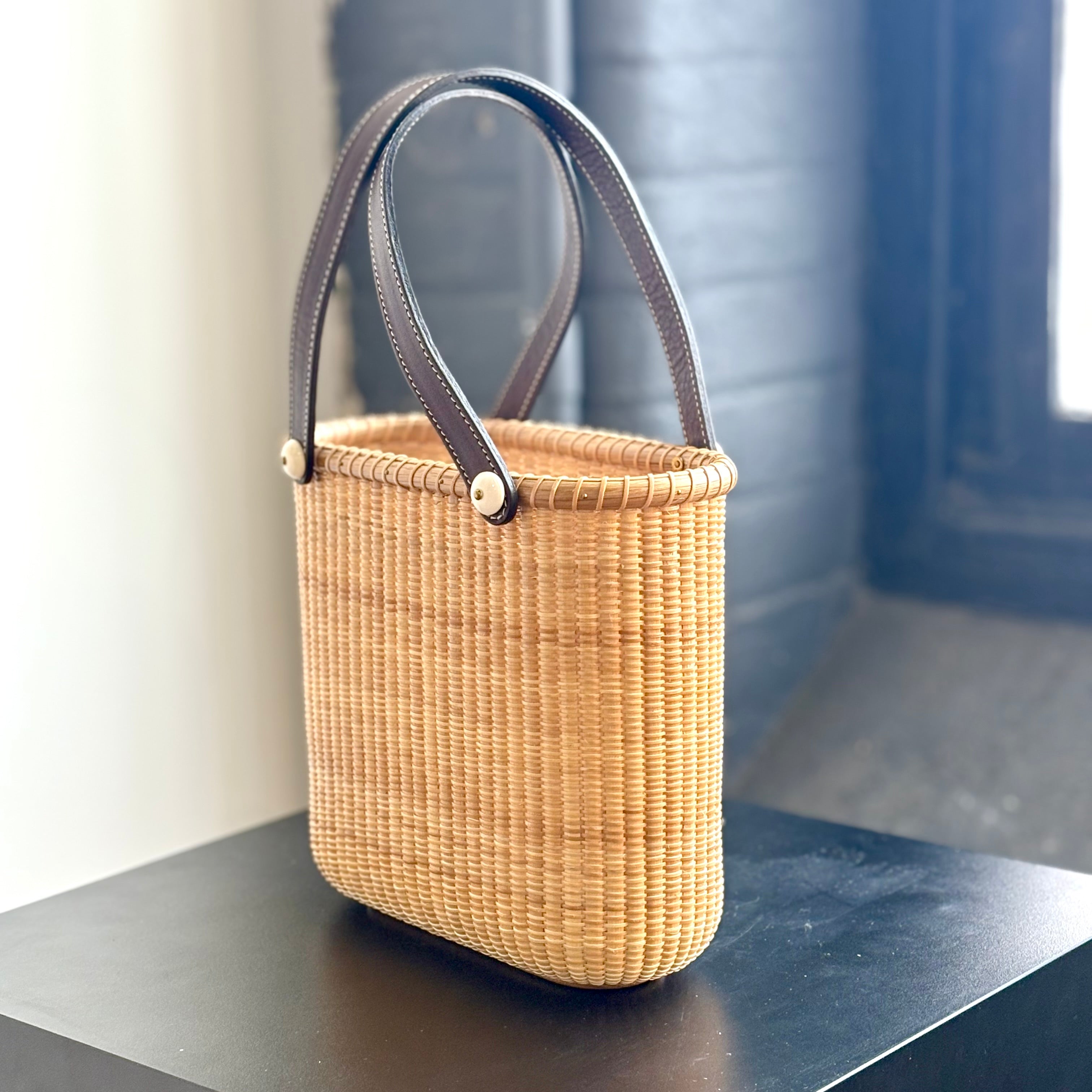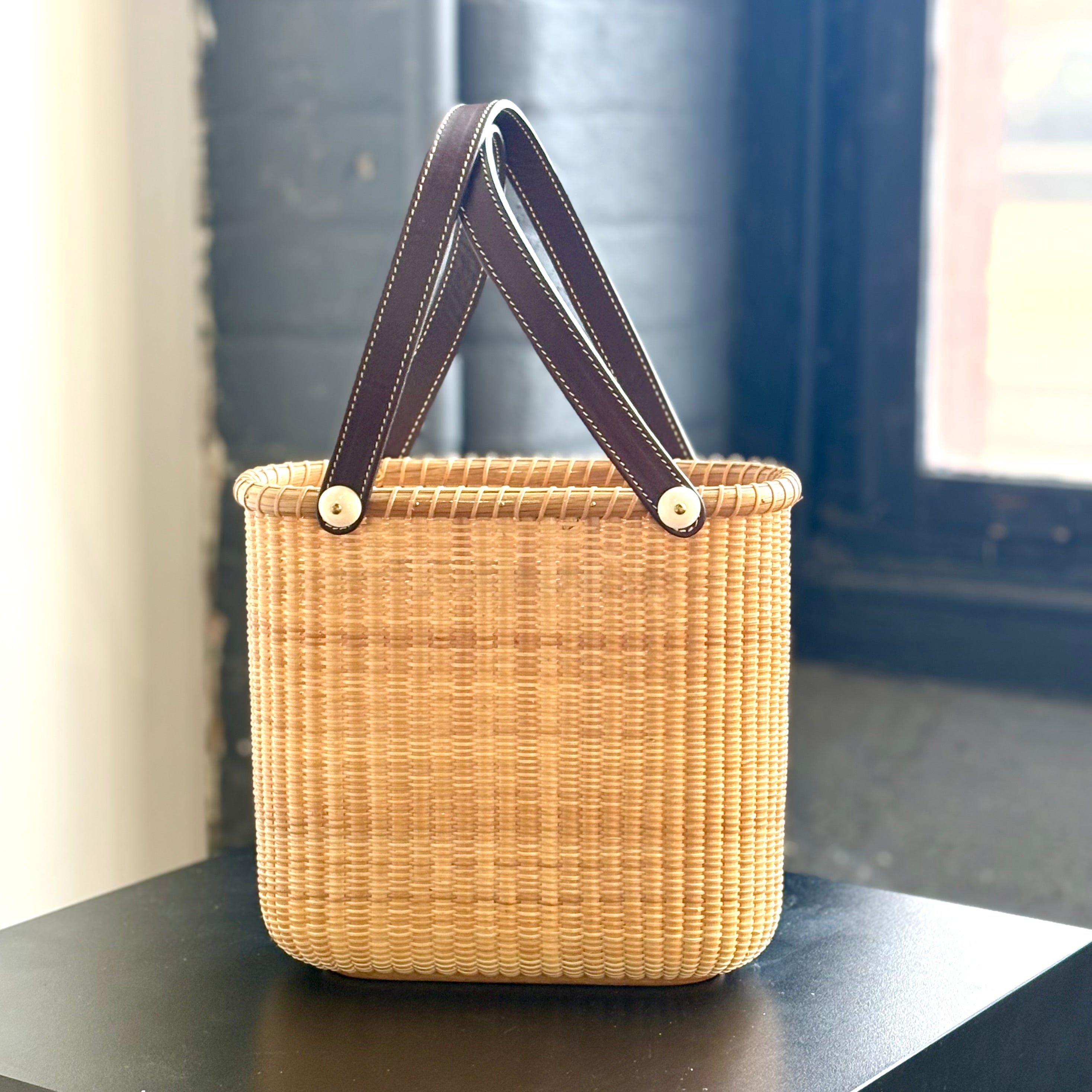 A unique fusion of tradition and versatility, this handwoven Nantucket tote basket by Japanese artist Akemi Rice pairs timeless structure with elegant ease. Crafted with fine cane and finished with leather handles, it functions beautifully as a handbag—light yet durable, with room for daily essentials. The interior can be left open or lined with a drawstring cloth bag, furoshiki, or your own creative solution. A piece that carries not only your belongings, but also the quiet grace of masterful handwork.