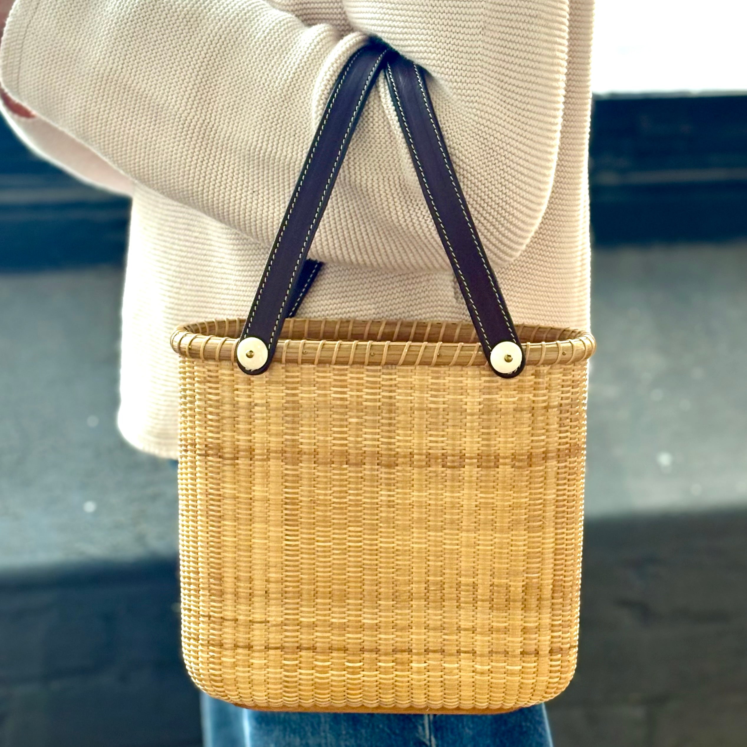日本人アーティスト、アケミ・ライスによる手編みのナンタケット・トートバスケット。細やかな籐編みとレザーハンドルの組み合わせが、伝統とモダンな感性を美しく融合させています。軽くて丈夫なつくりは、日常使いのハンドバッグとして理想的。内側には巾着袋や風呂敷などを合わせることで、より実用的かつ個性的な使い方が可能です。丁寧な手仕事が息づく、静かな存在感を携えた一品です。