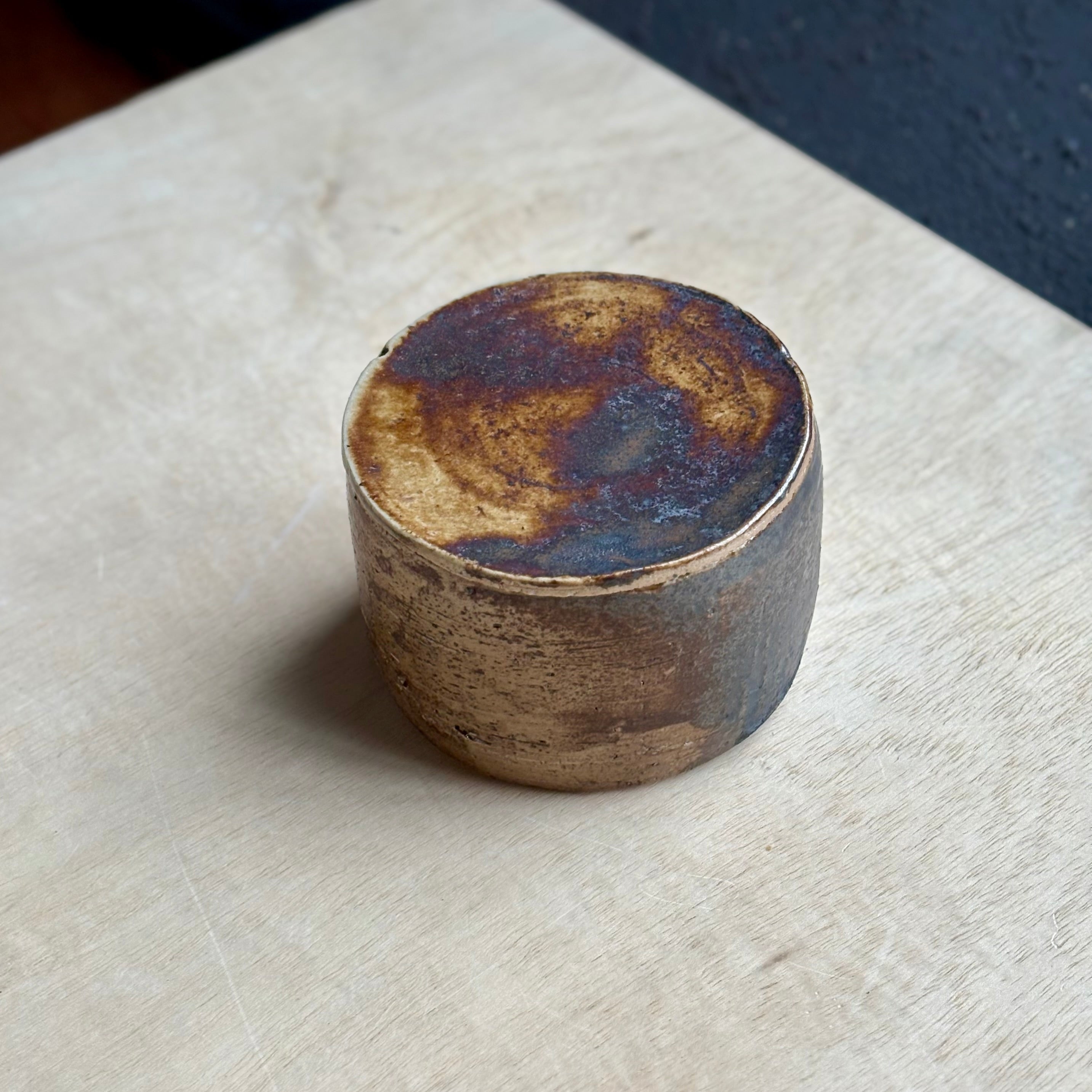 Thrown by Andy Vlock from porcelain and finished with a manganese wash, this wood-fired salt jar carries a quiet strength. The firing transforms the surface into soft shades of gray, violet, and bronze, revealing subtle movements of flame and mineral. Simple, tactile, and timeless—perfect for salt, spices, or small treasures.
