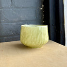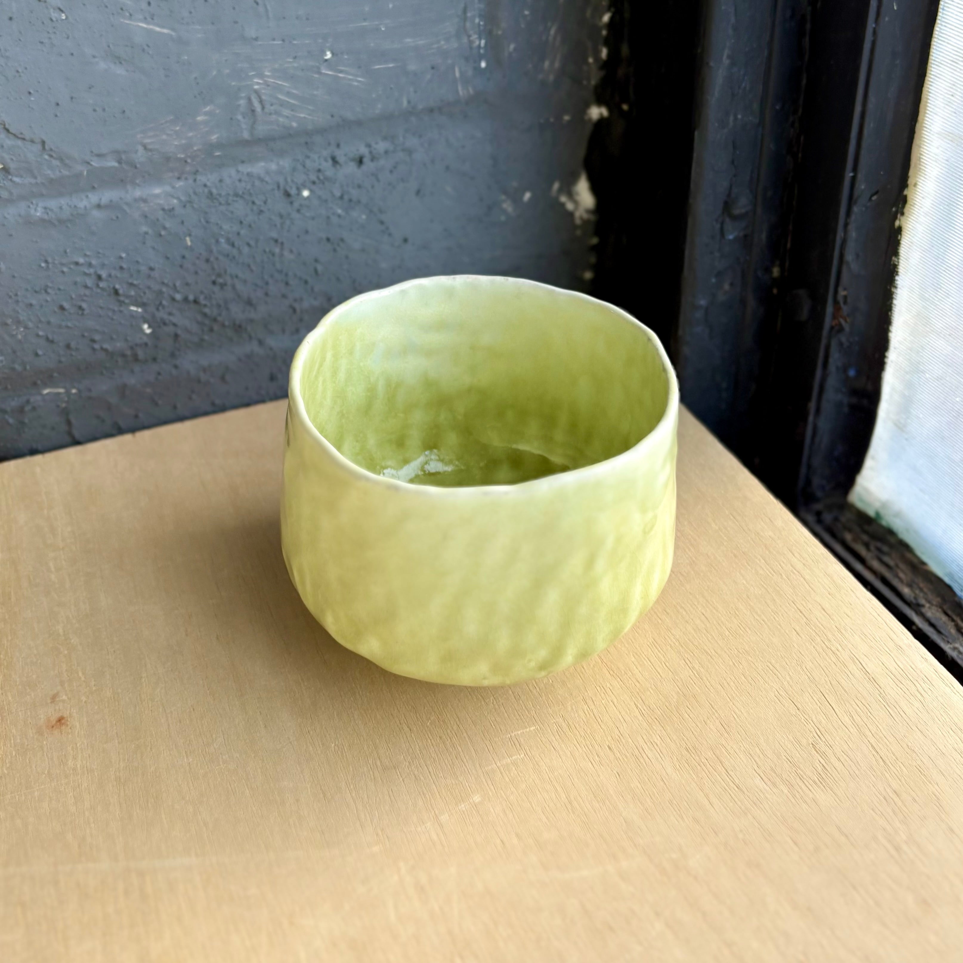 A softly rounded matcha bowl by Ayumi Nojiri, handbuilt with a gentle, irregular form that settles naturally in the hands. The surface carries a quiet rhythm of touch—subtle undulations and dimples that catch the light and give the piece a living presence.
