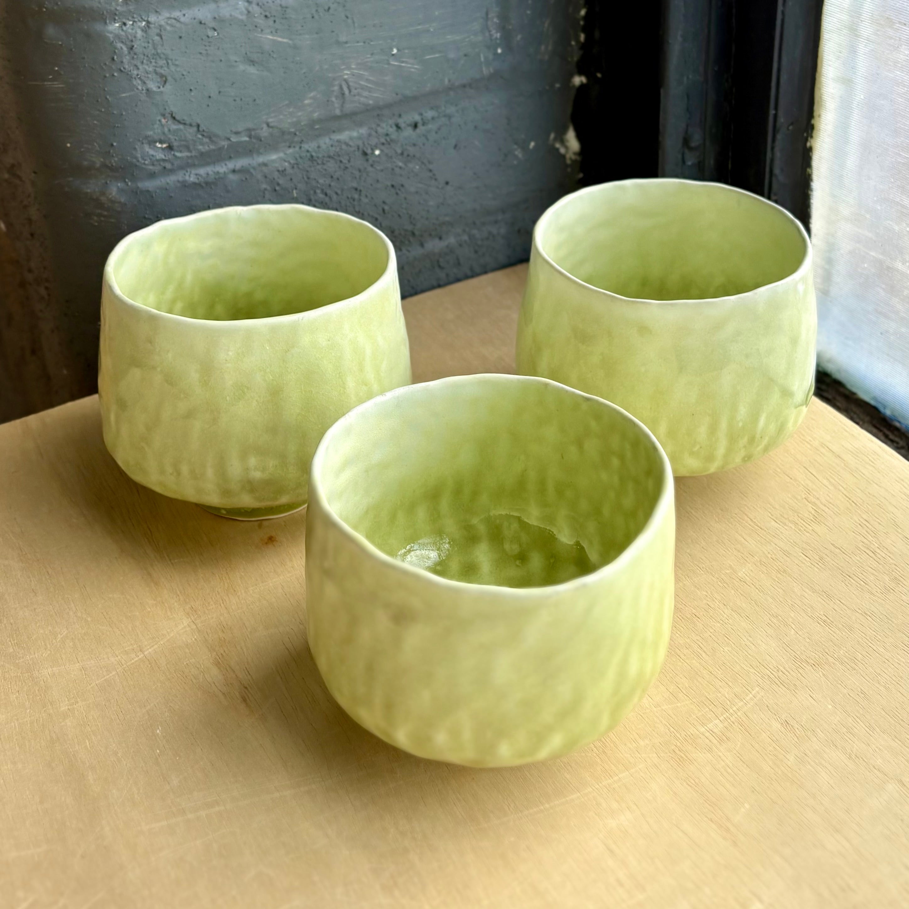 外側はやさしいマットな白釉で包まれ、内側には淡い茶の緑が広がり、底に向かって静かに溜まります。霧の中から芽吹く春の若葉のような、穏やかな対比です。