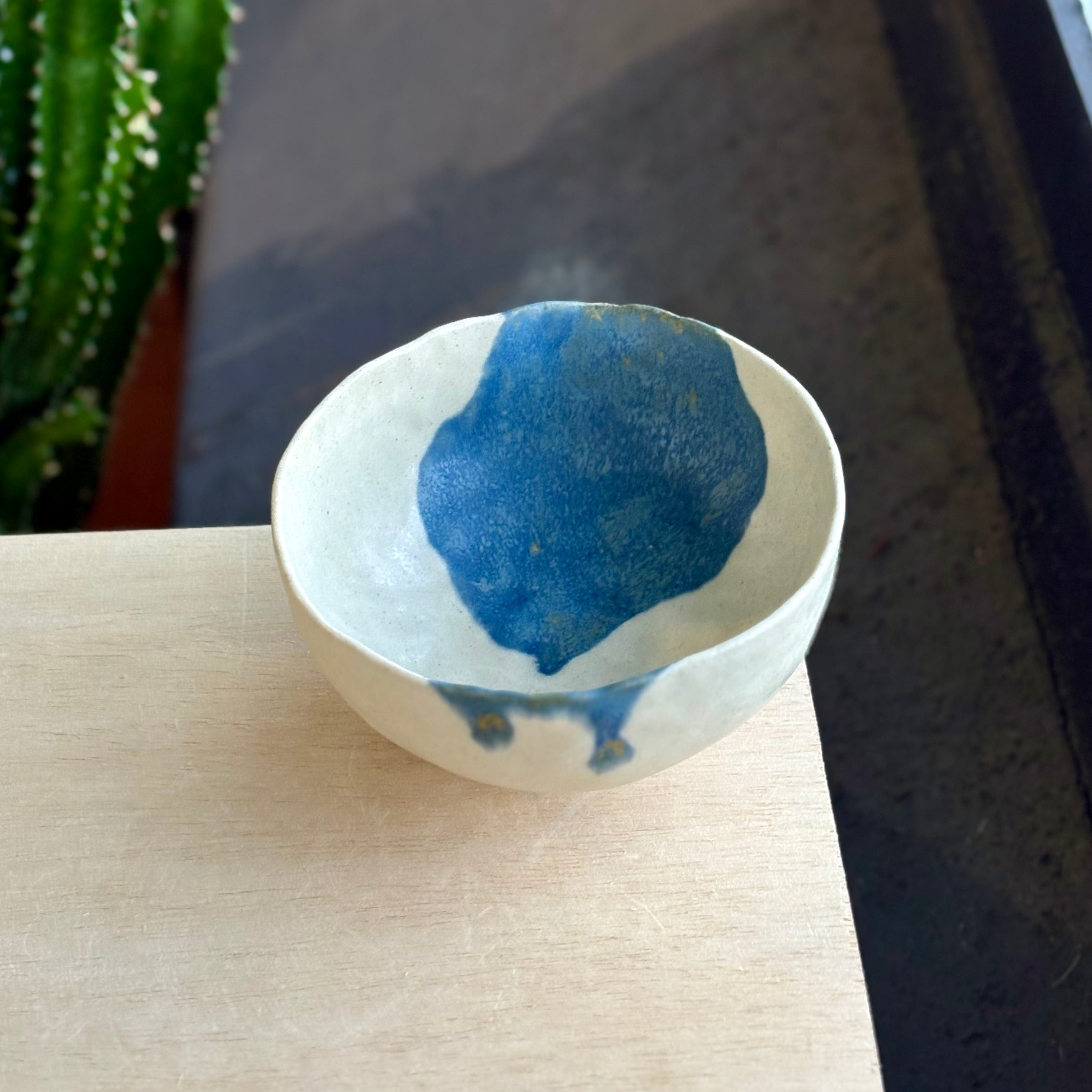 野尻あゆみさんの「滝」小鉢。手びねりのやわらかな非対称と、象牙色の土に流れるような藍釉が重なり、水が岩を流れ落ちる風景を思わせます。縁は水の流れのようにわずかに揺らぎ、静けさと動きを同時に湛えた器です。