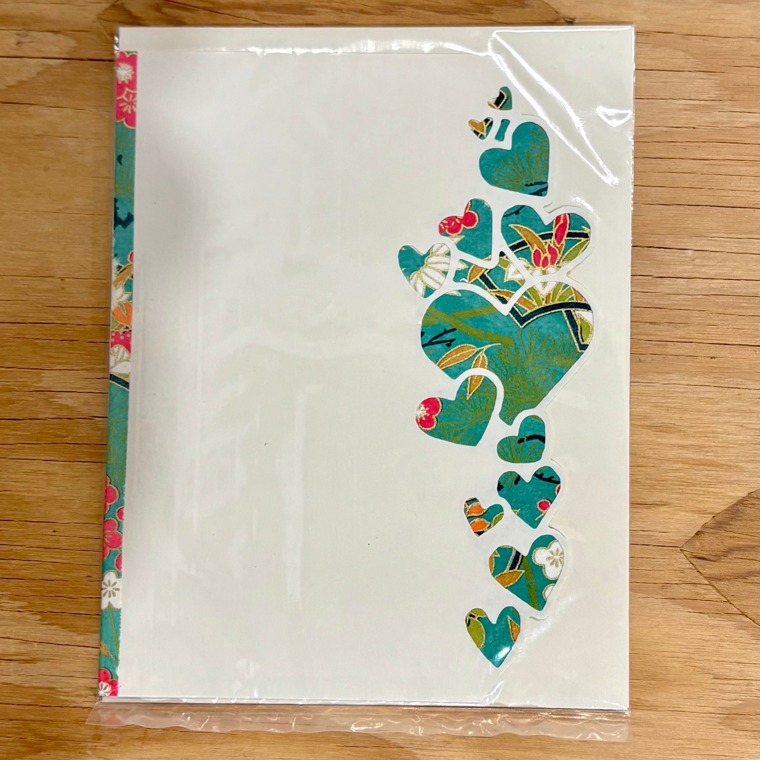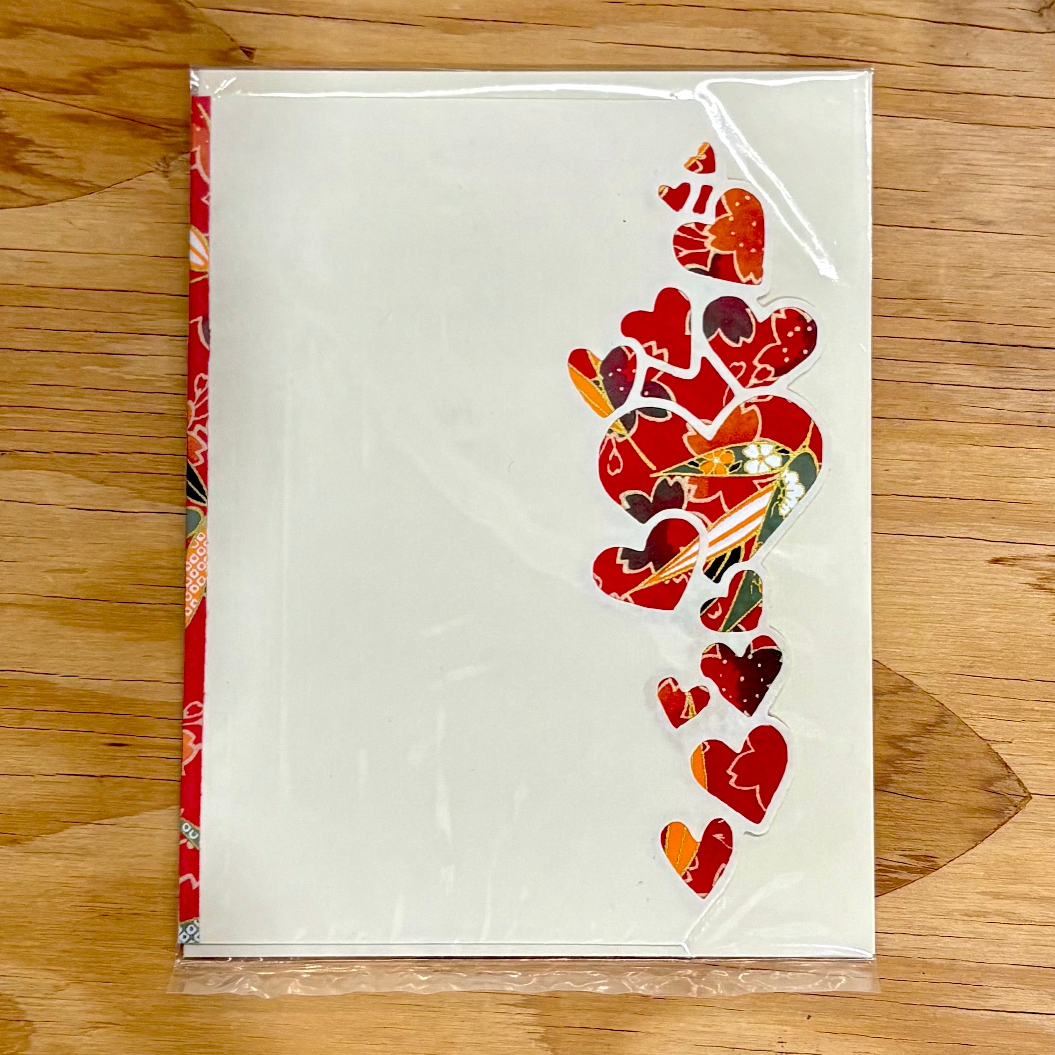 Deb Luekensによるハンドカットのグリーティングカードは、千代紙(友禅和紙)から切り出されたハートのモチーフが、縦に連なるように配置されています。千代紙は、手漉き和紙に伝統的な文様をシルクスクリーンで施した日本の装飾紙で、一点一点異なる表情を持っています。