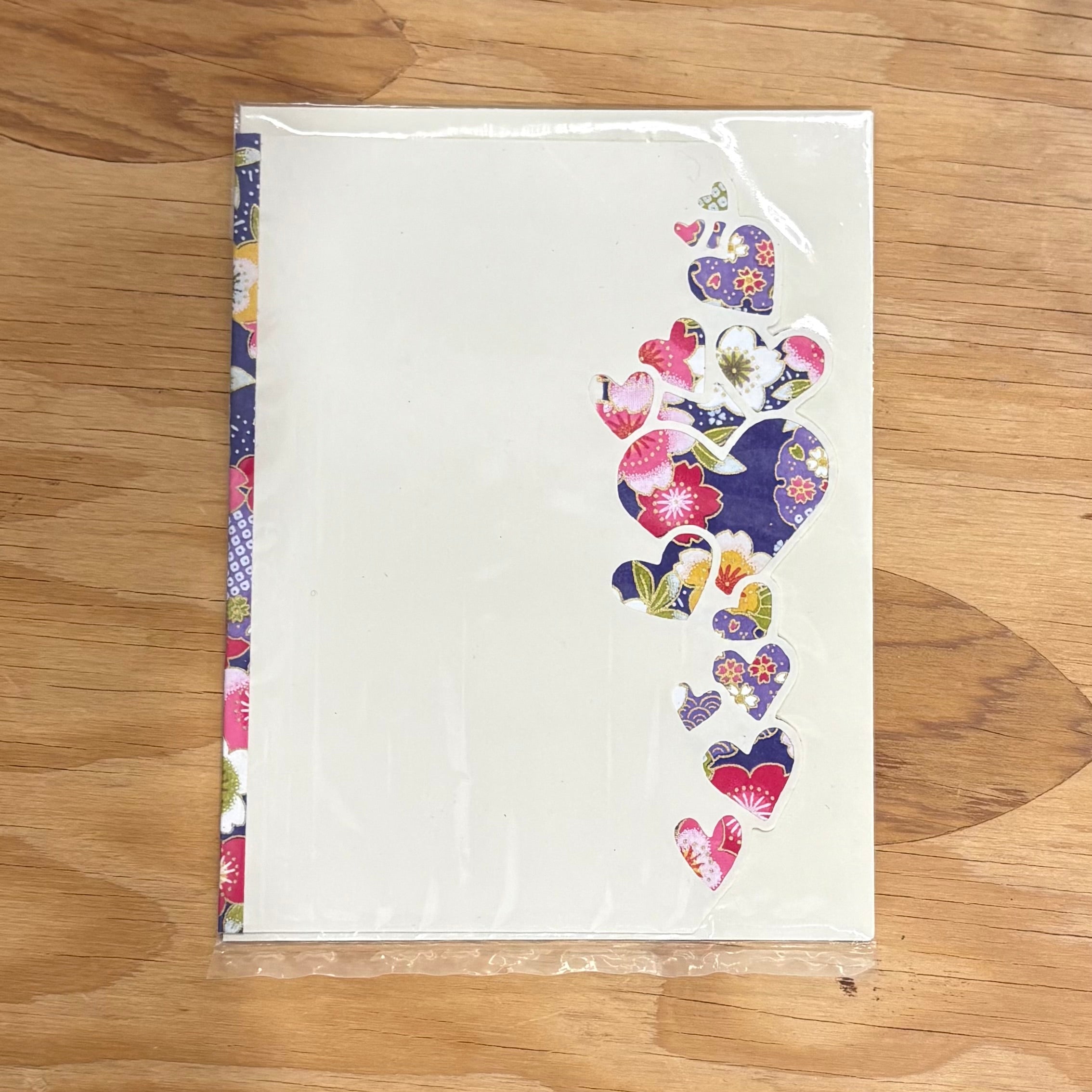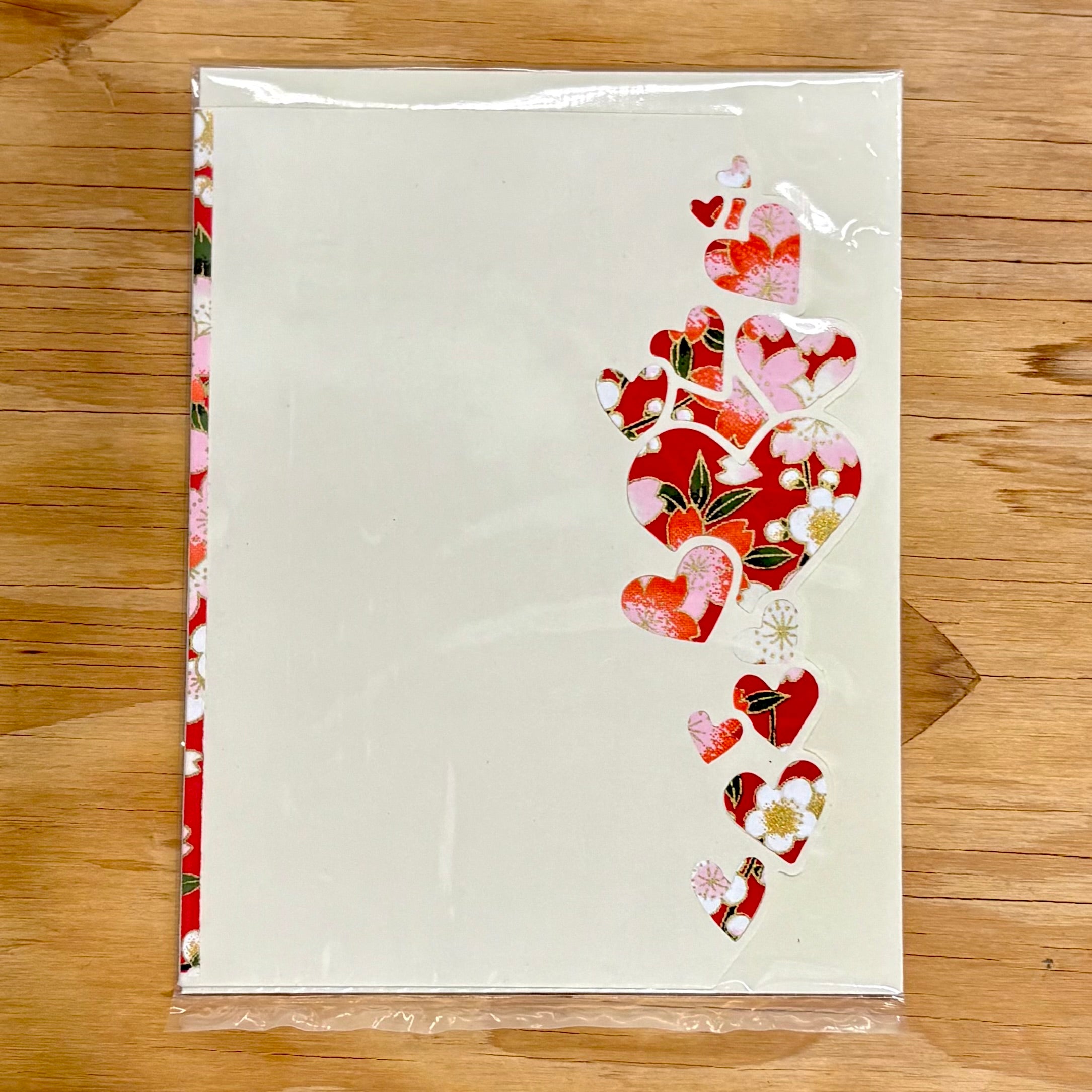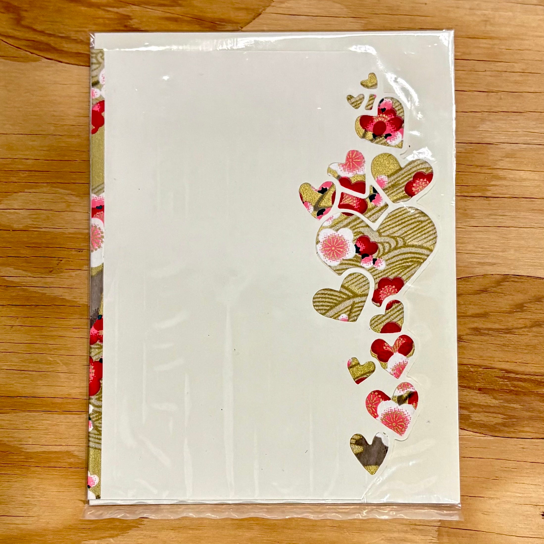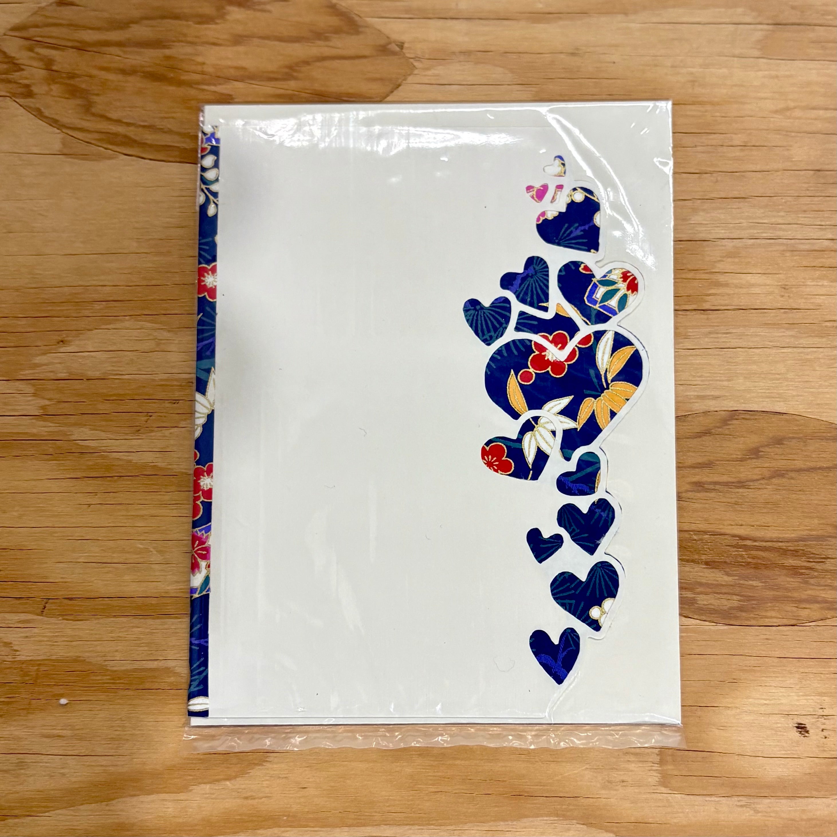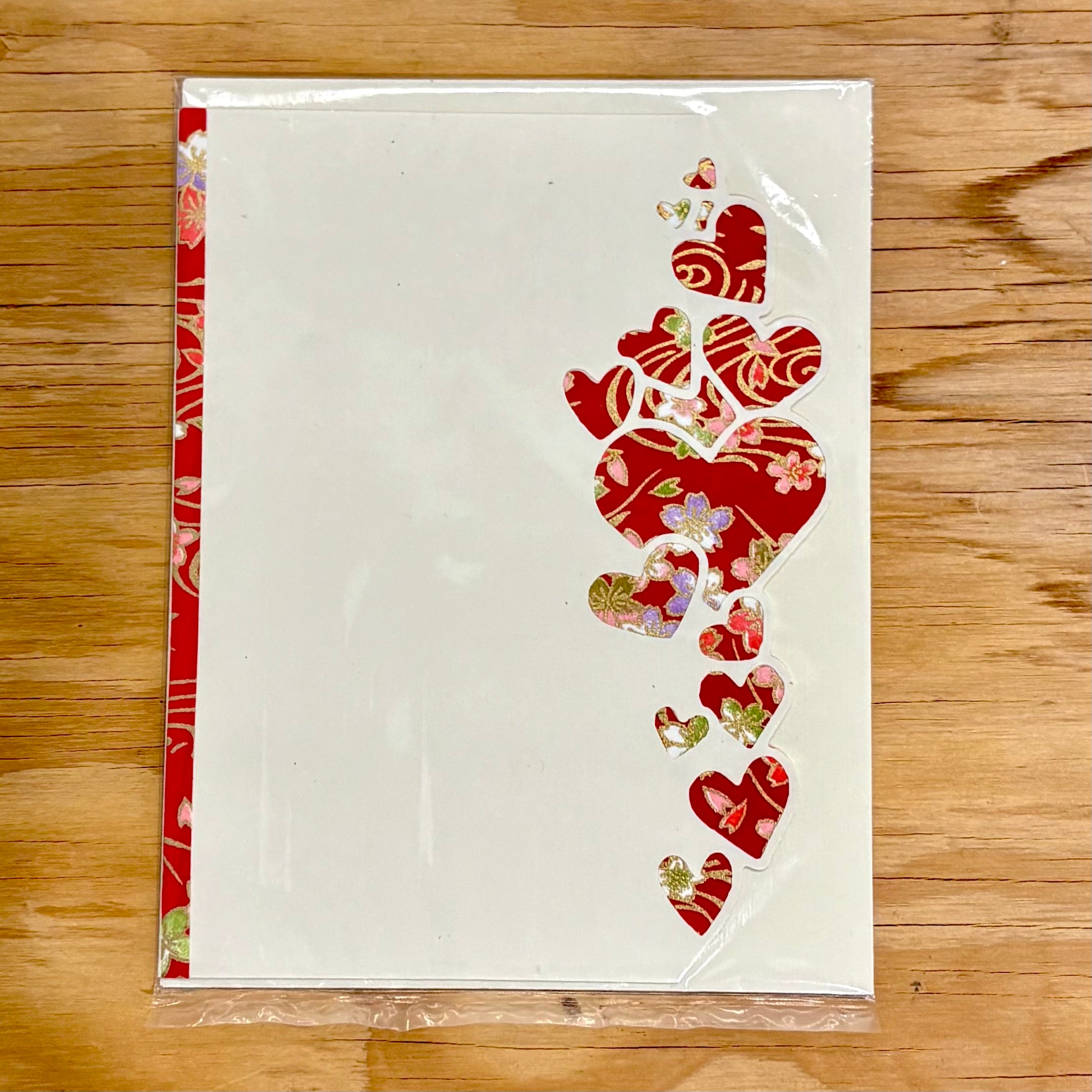 このカードの特徴は、右側の縁が直線ではなく、ハートの連なりに沿って丁寧にカットされている点です。さりげない立体感と手仕事の温もりが感じられ、上品で印象的な仕上がりとなっています。カードの内側は無地で、さまざまな用途にお使いいただけます。封筒が1枚付属します。