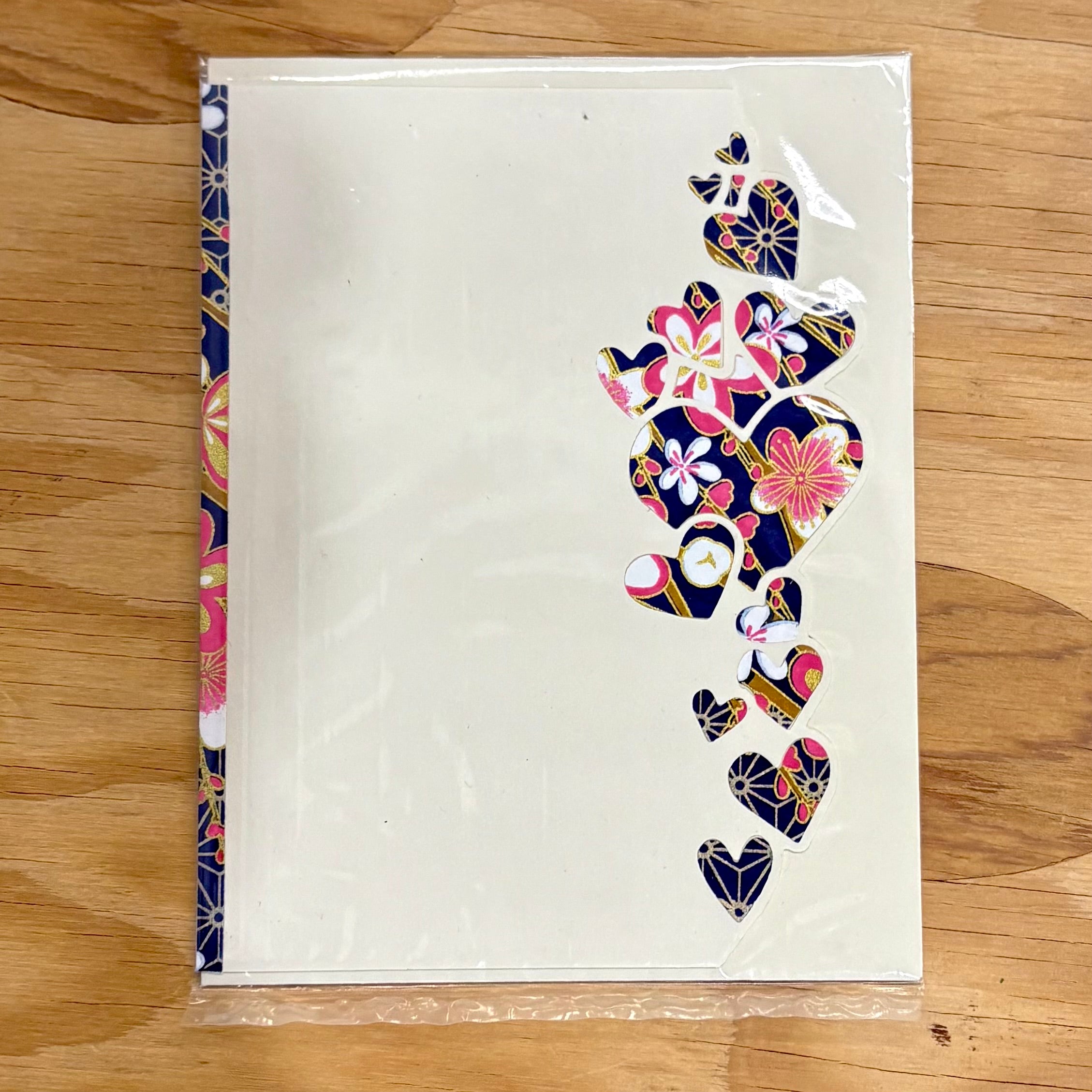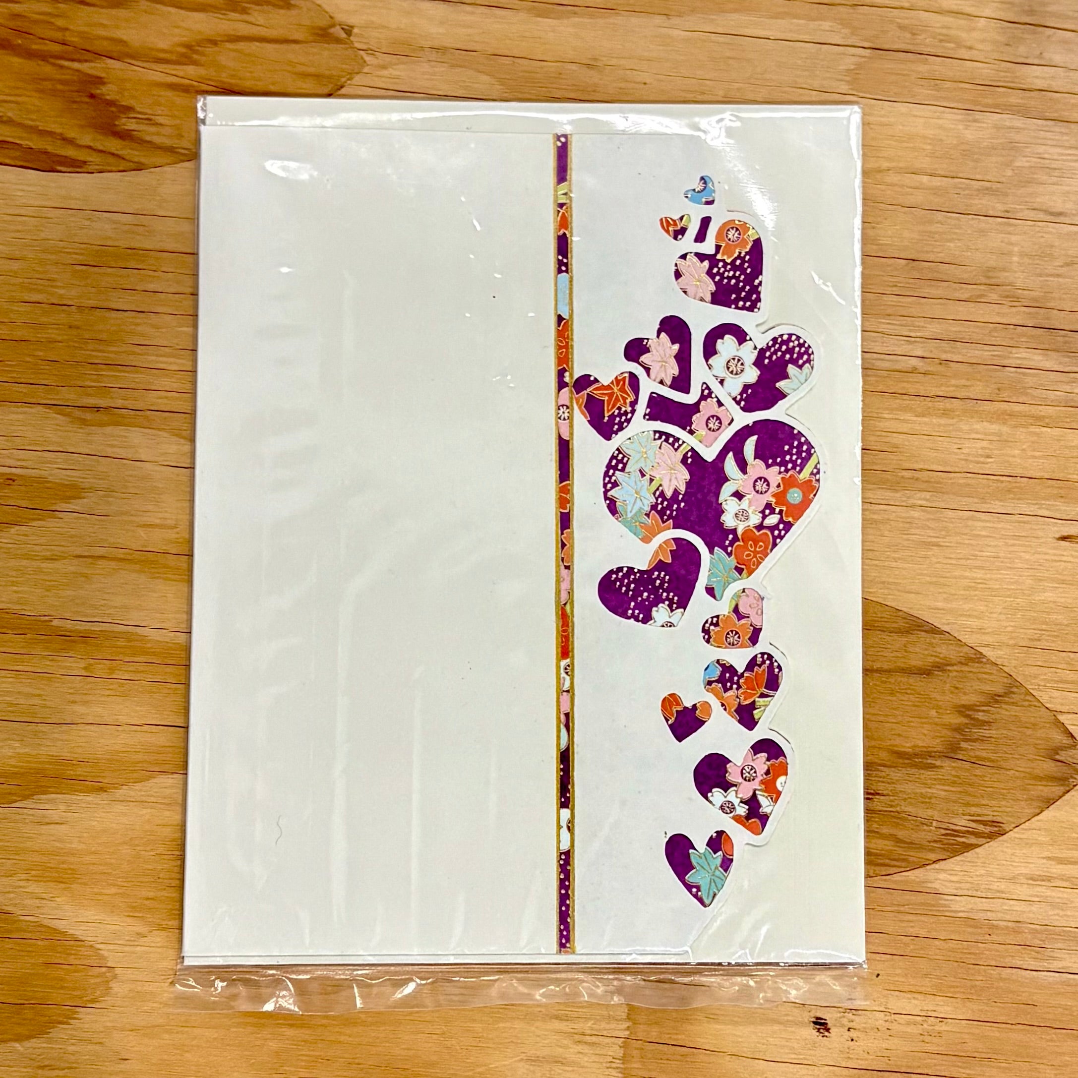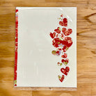 These handcut greeting cards by Deb Luekens feature cascading heart forms cut from chiyogami—decorative Japanese paper traditionally made by silkscreening patterns onto handmade washi. Each heart is carefully cut and arranged by hand, creating a gentle vertical rhythm of color and pattern across the card’s surface.