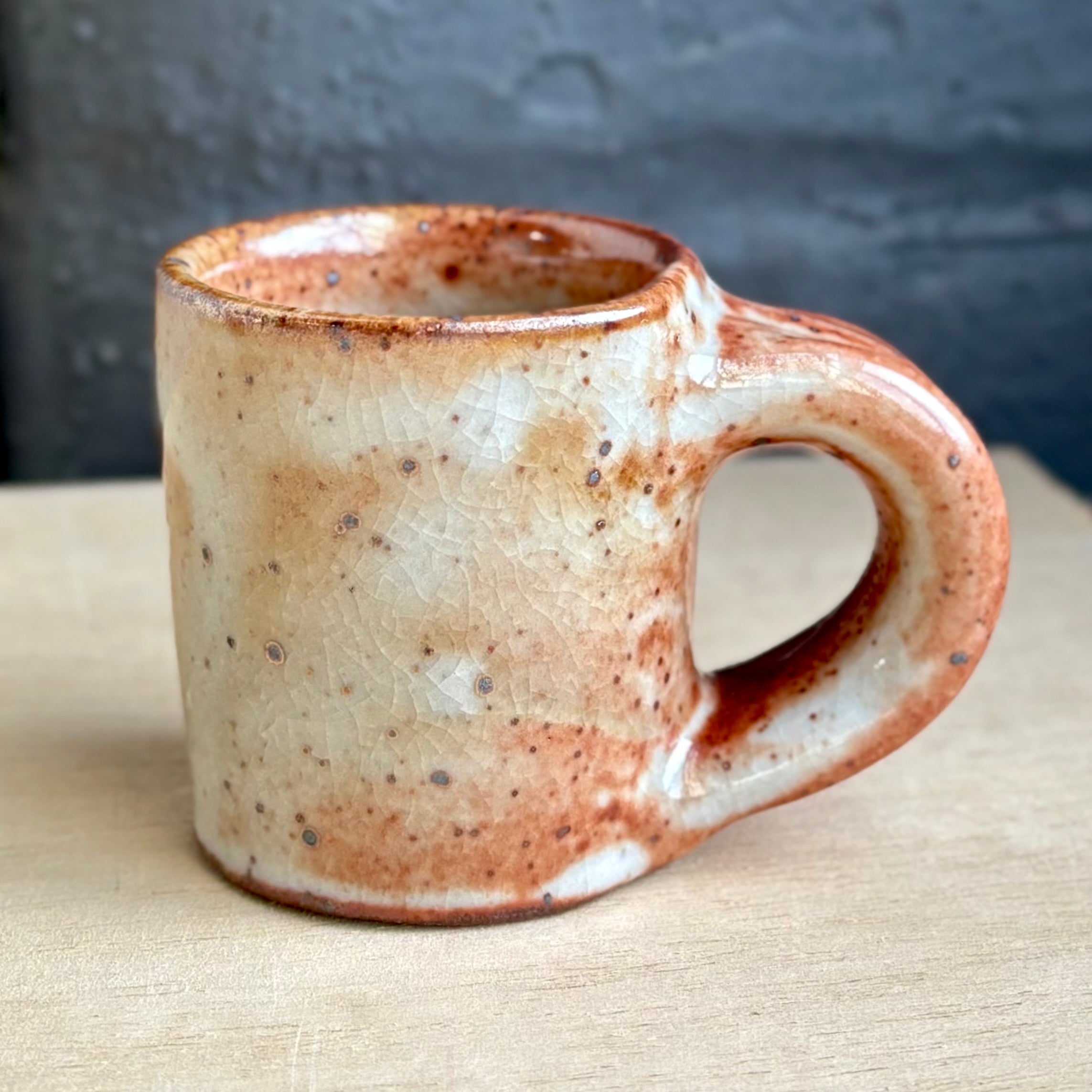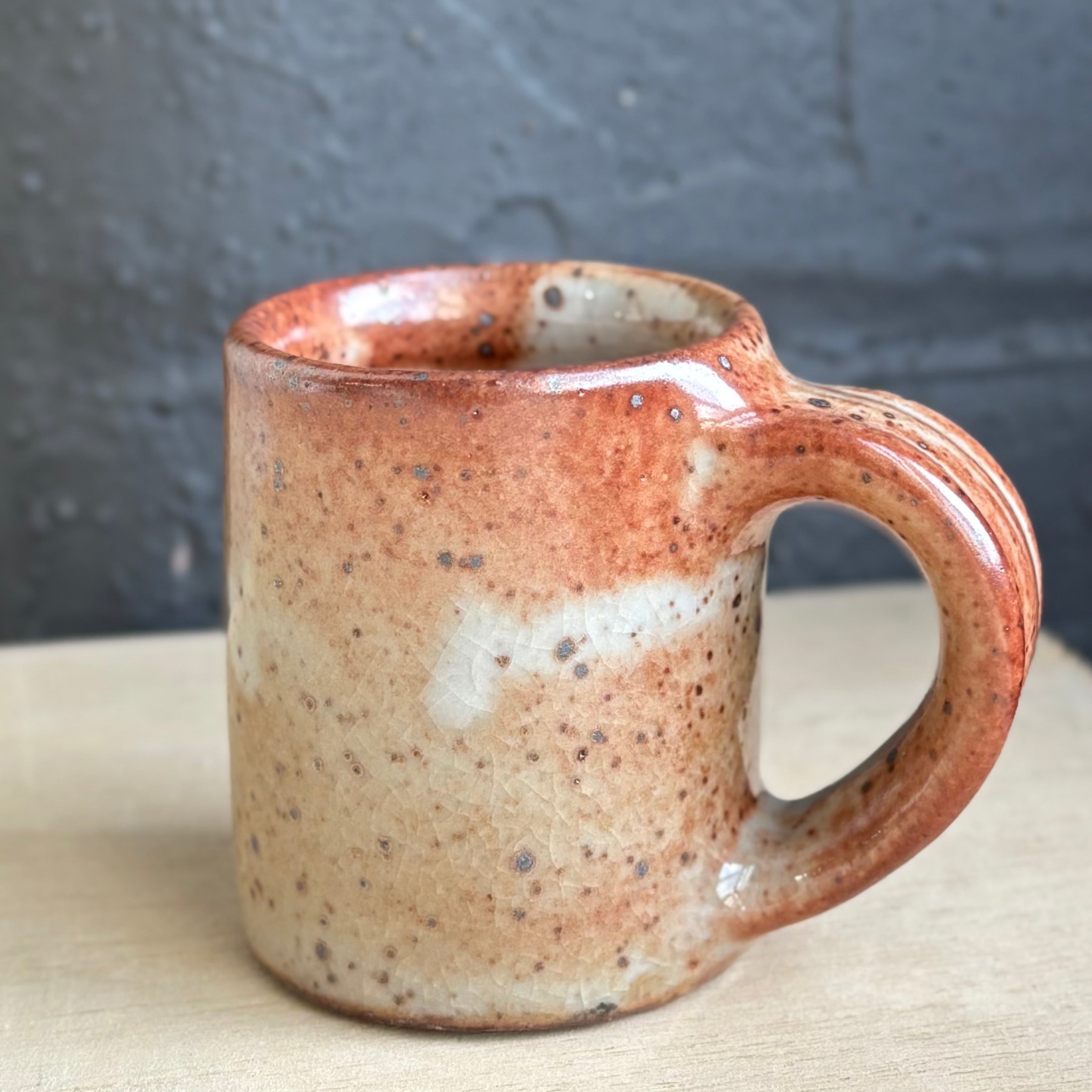 These small espresso cups by Josh Kopin glow with the heat of their making—each one a vivid firefall of white shino glaze, where soft cream and rust-red collide across the clay body. The rounded proportions and compact size feel grounding in the hand, while the flared handle adds lift and ease. Every cup is distinct, shaped by flame, glaze flow, and Josh’s intuitive eye.