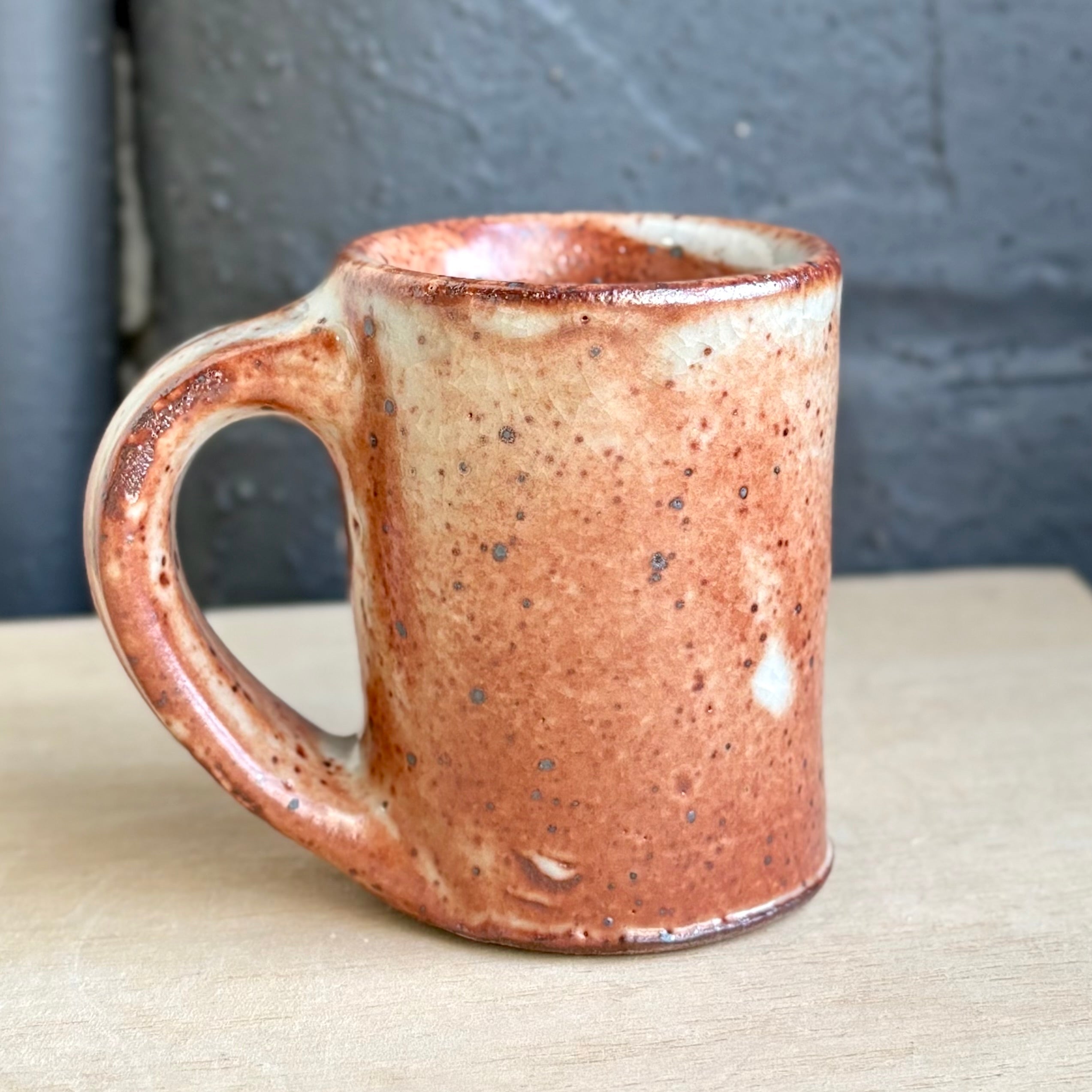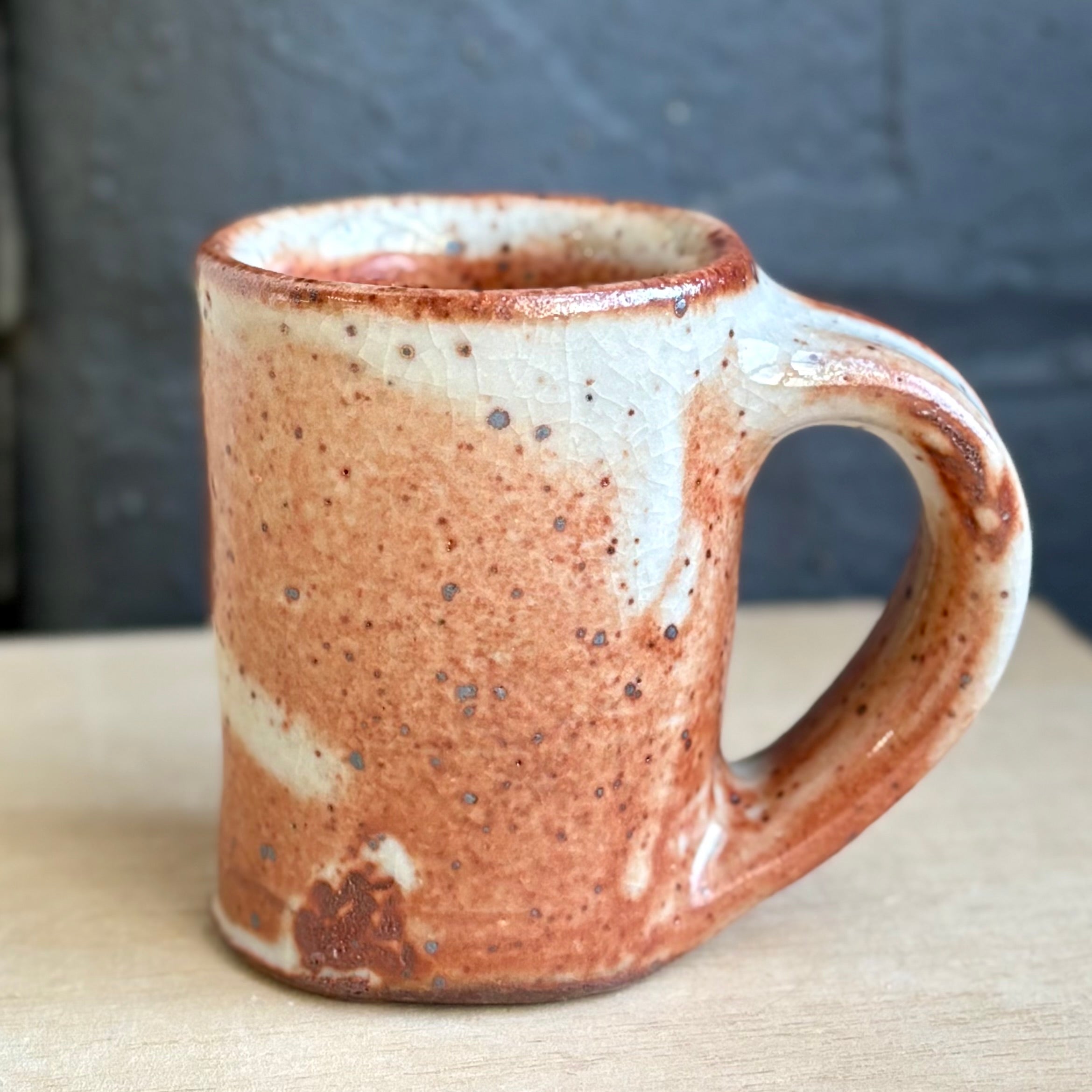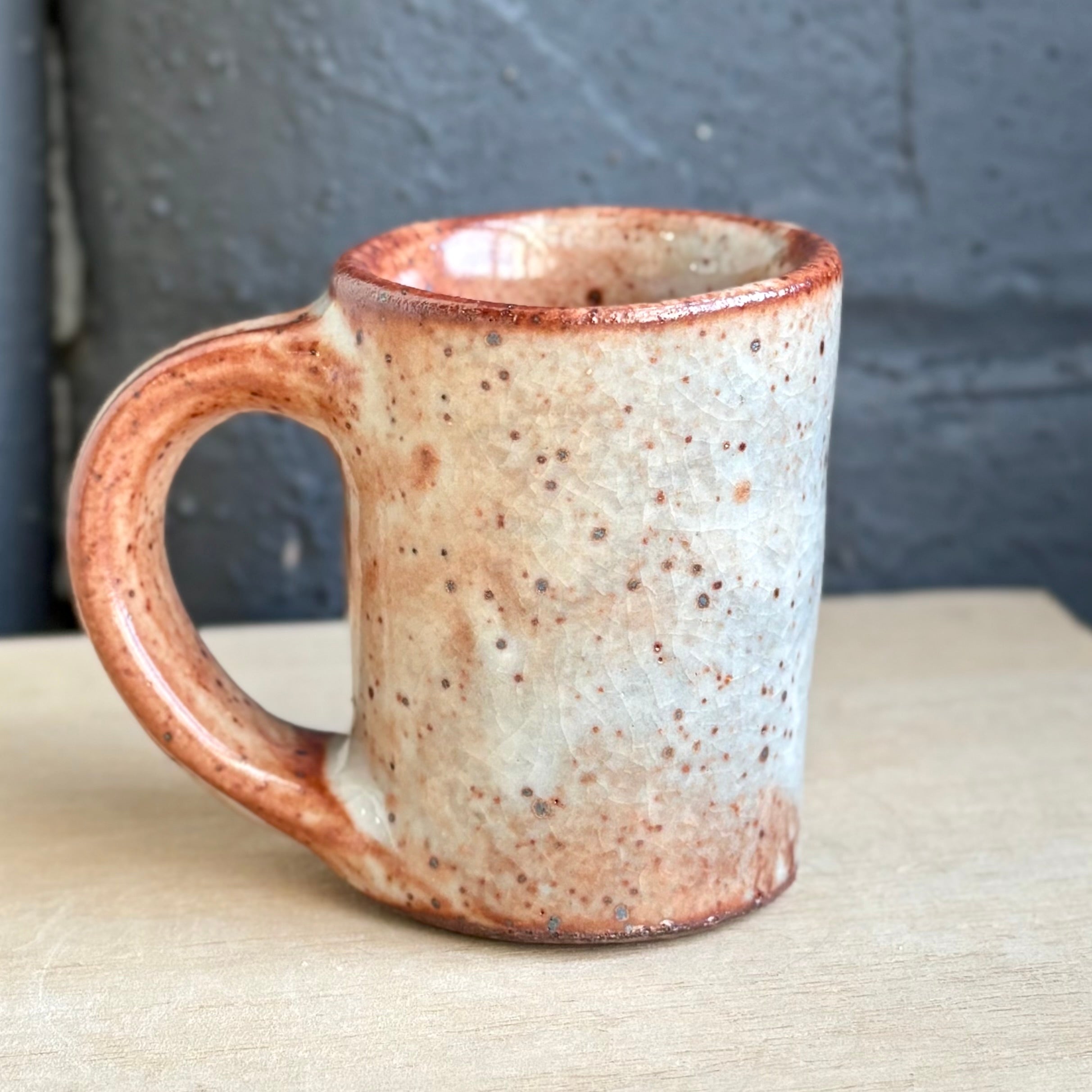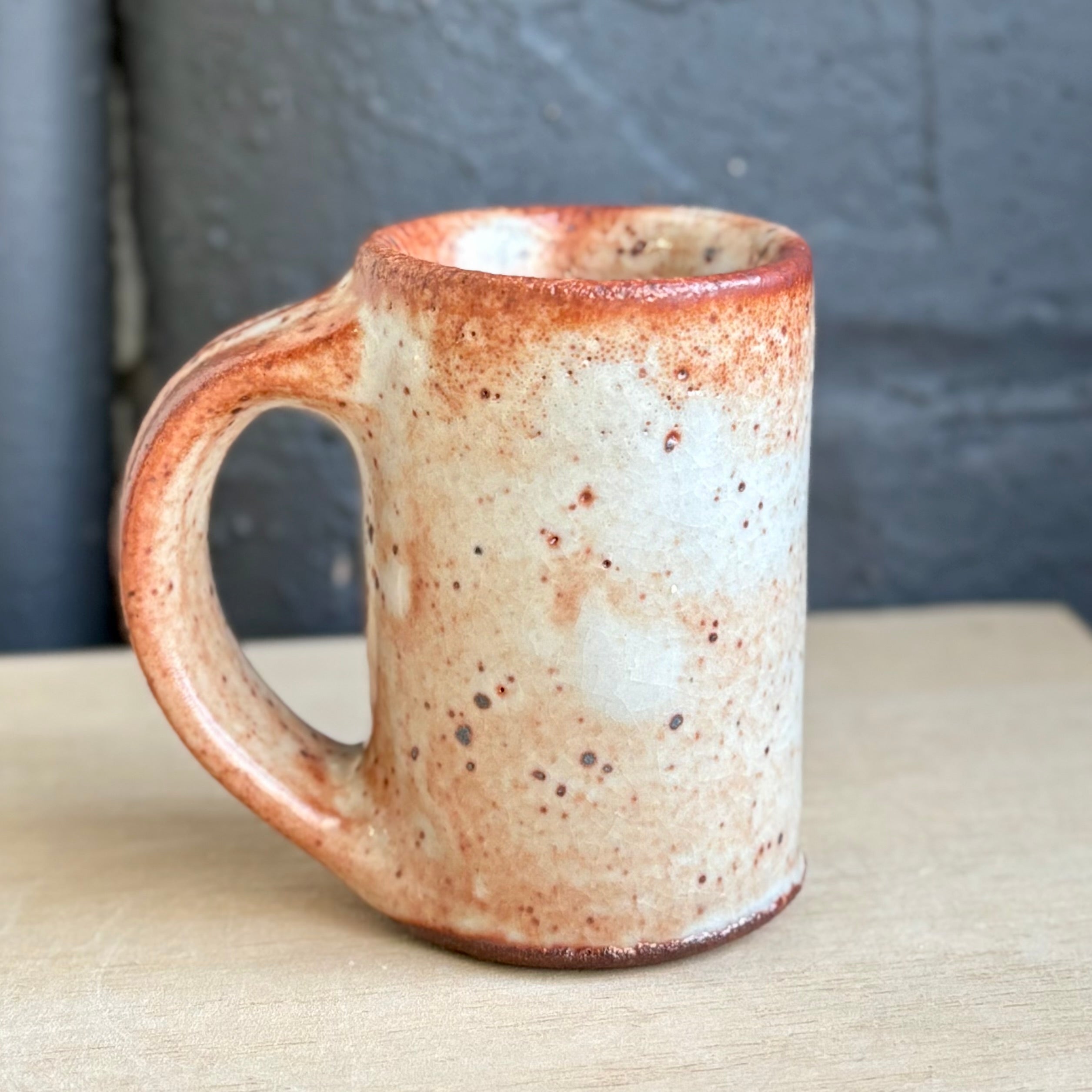 Josh Kopin’s large espresso cups burn with a quiet intensity. Each one features his signature Firefall glaze, a layered field of creamy whites and deep rust that moves like smoke across the surface. The form is slightly taller and more upright than his smaller espresso cups, with a generous handle and satisfying weight in the hand. A perfect companion for a double shot, or a bold little pour of morning light.