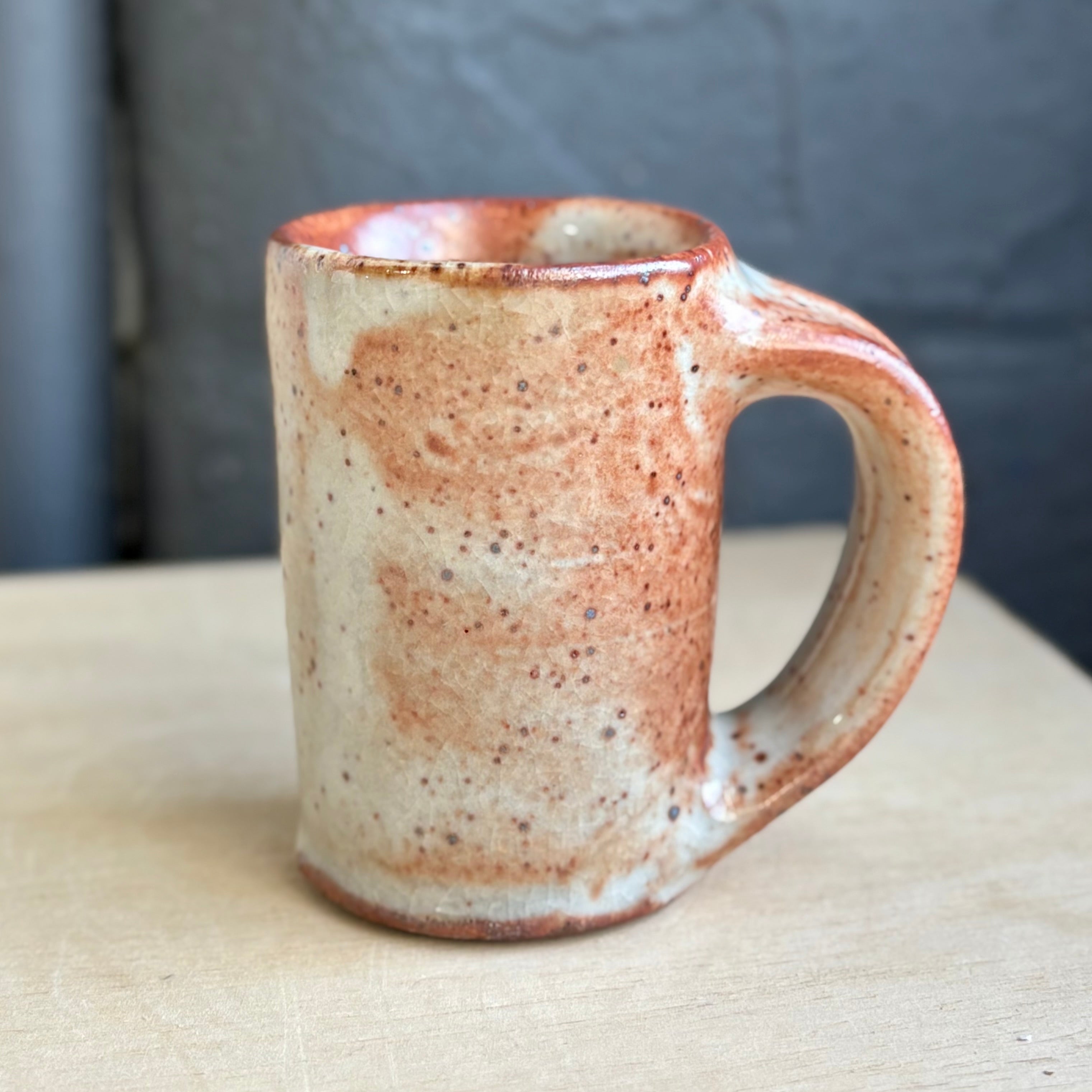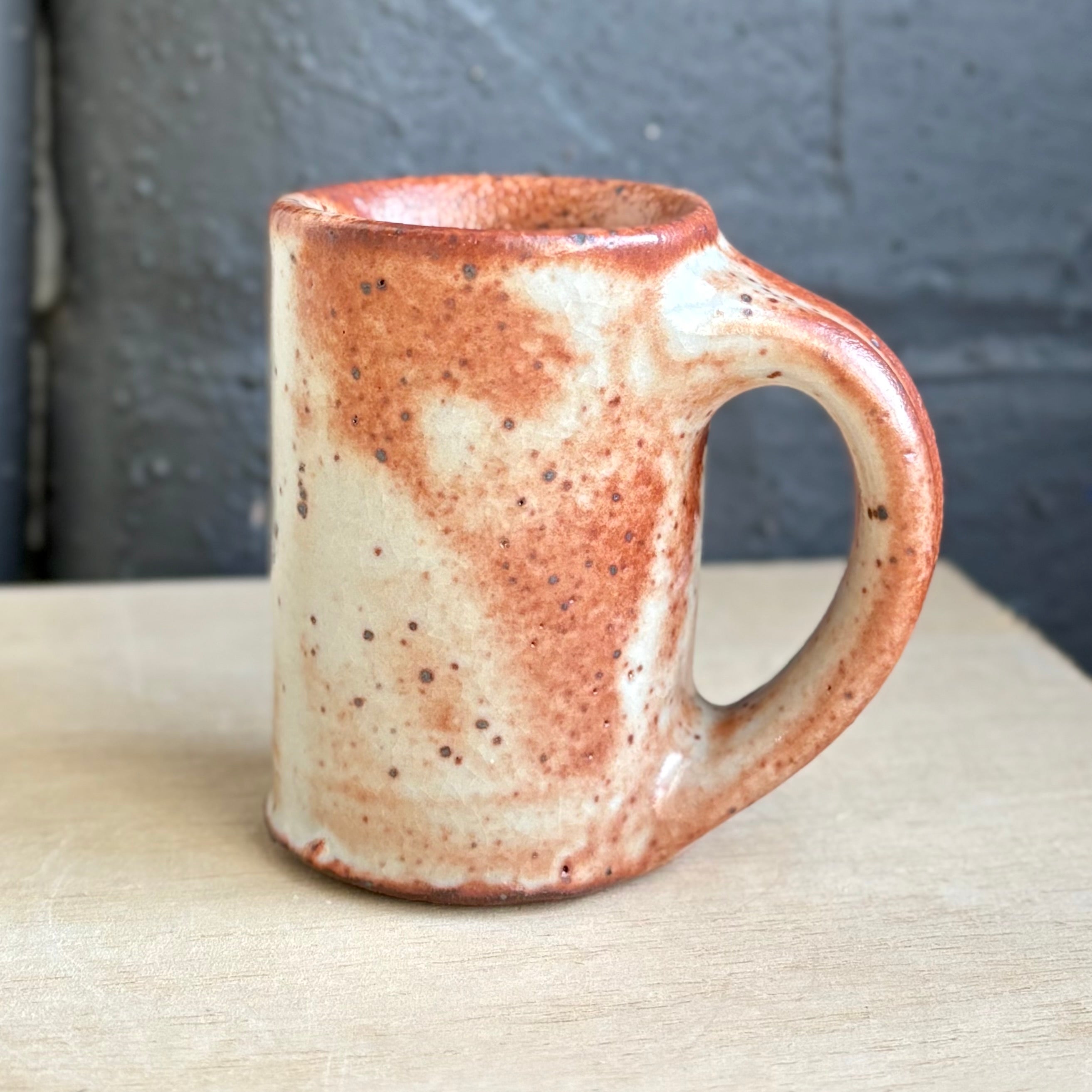 ジョシュ・コーピンによるラージサイズのエスプレッソカップは、静かな熱を湛えたような佇まい。ファイアフォール・グレーズと名付けられた釉薬が、クリーム色と深い赤錆色の層を描きながら、表面を煙のように流れていきます。小さなエスプレッソカップに比べて、少し背が高く、容量もたっぷり。手にしたときの重量感と大きめの取っ手が、力強さと安心感をもたらしてくれます。