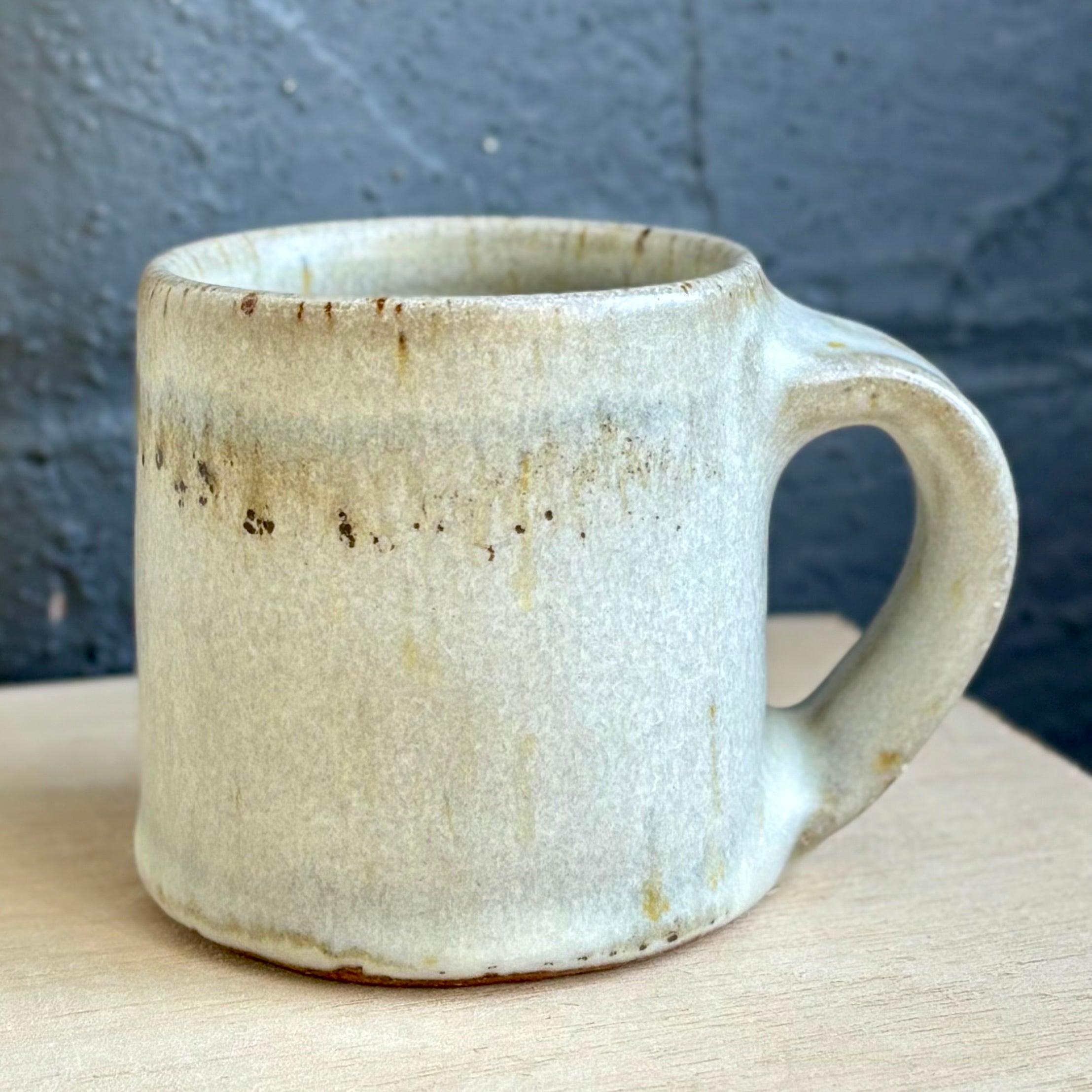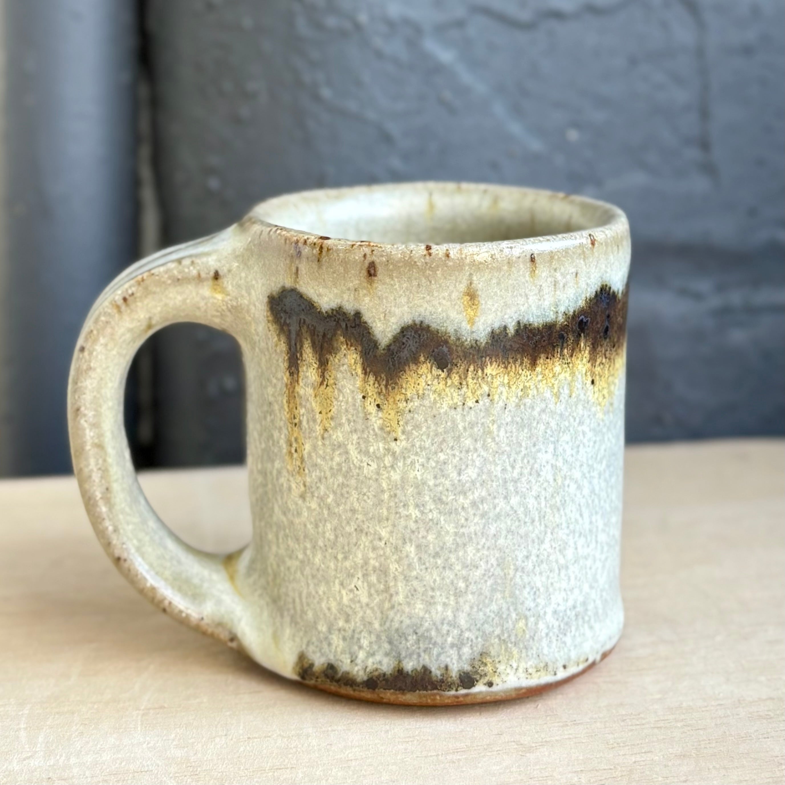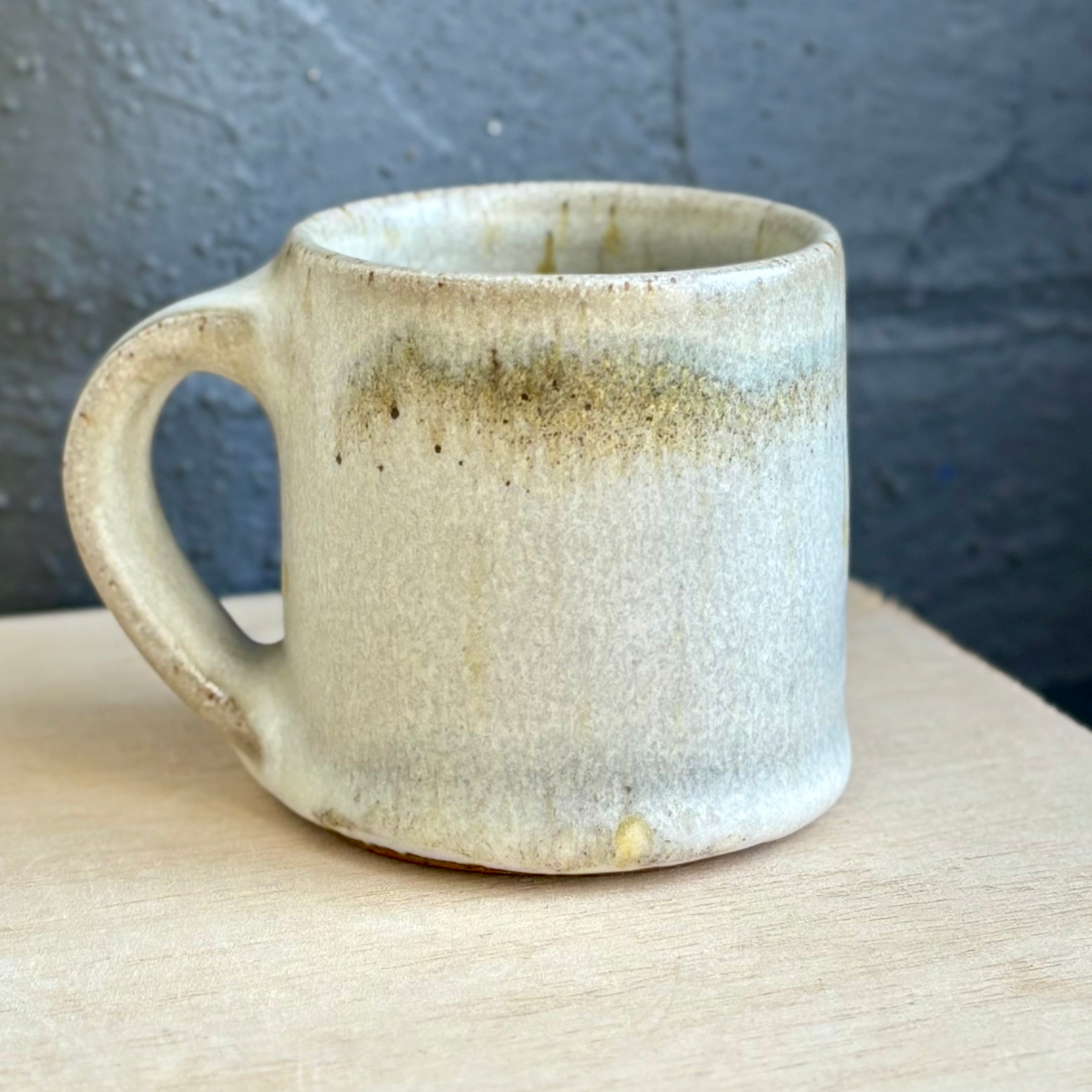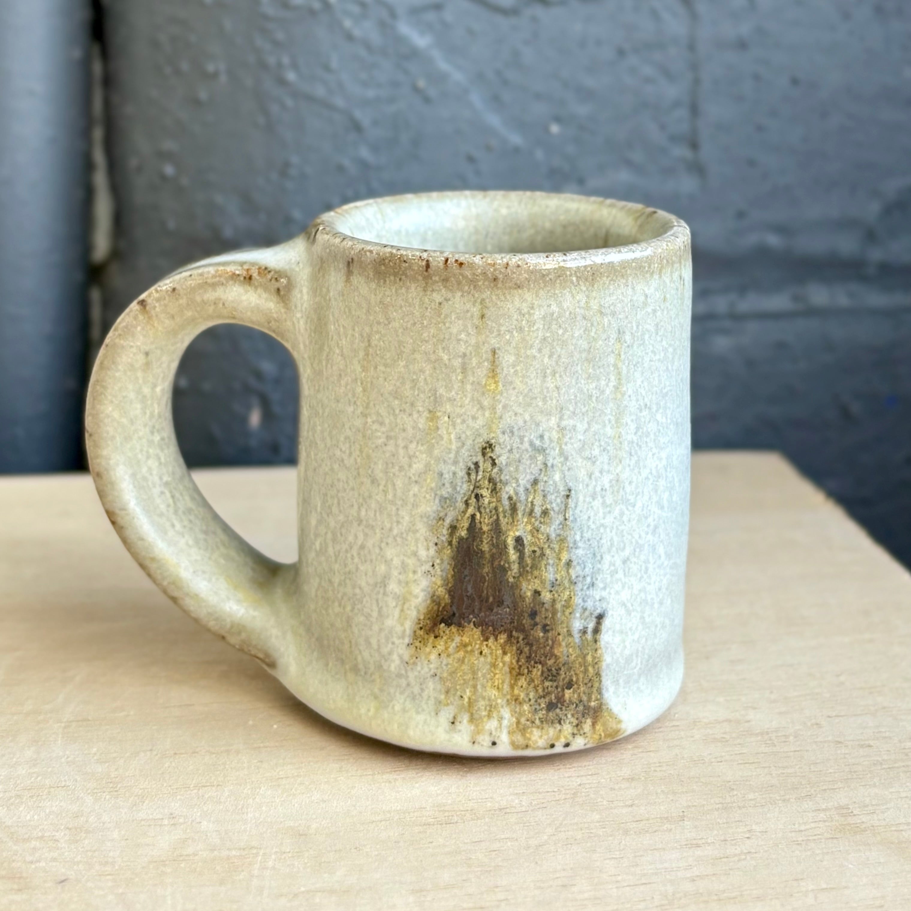 These slightly larger espresso cups by Josh Kopin are wheel-thrown and gas-fired, part of the warm and understated “Gold Drift” series. The surface features a soft cream glaze that breaks into earthy tones and golden blushes, varying beautifully from piece to piece. Comfortably weighted with a generous handle, they’re well-suited for a double shot of espresso or a small pour of coffee.