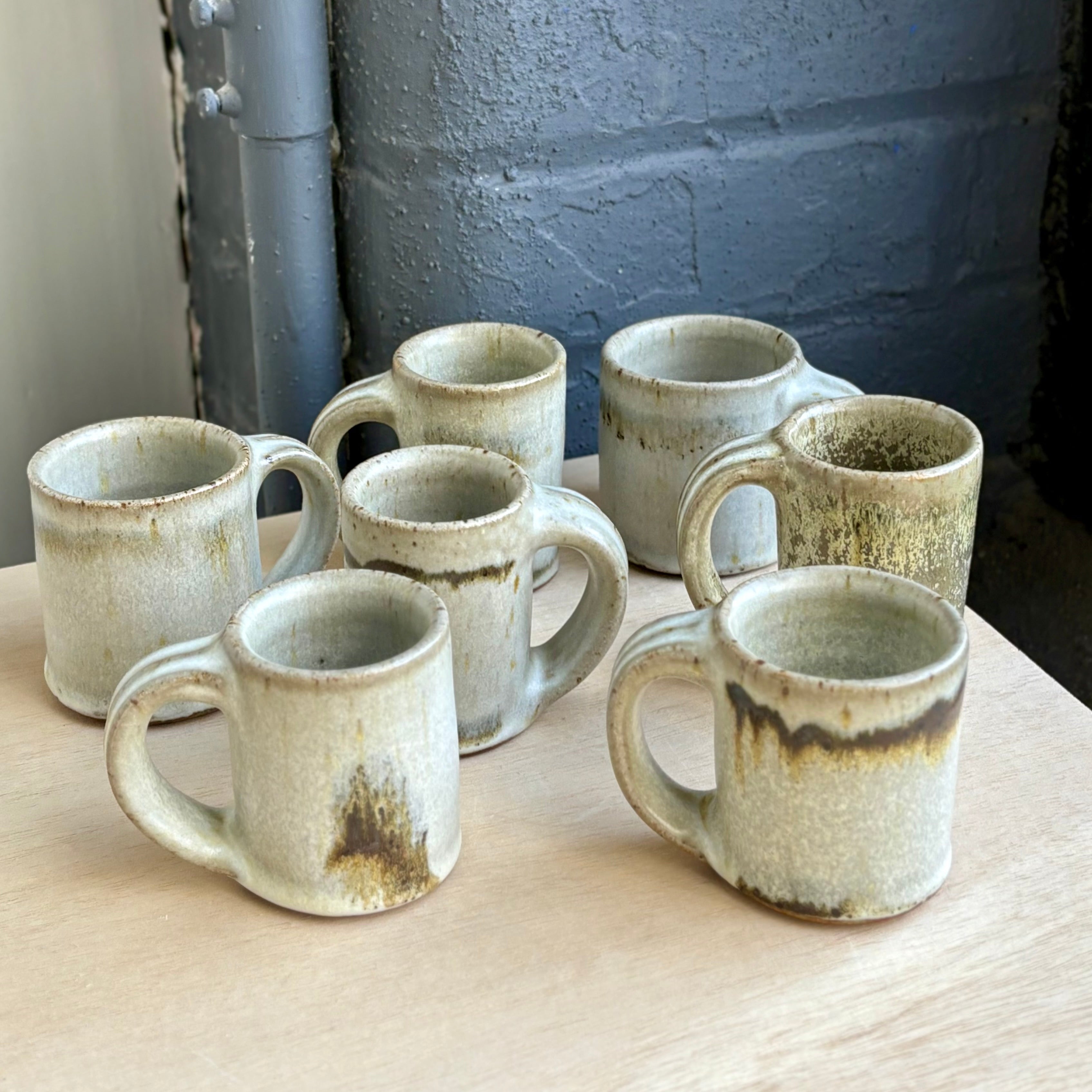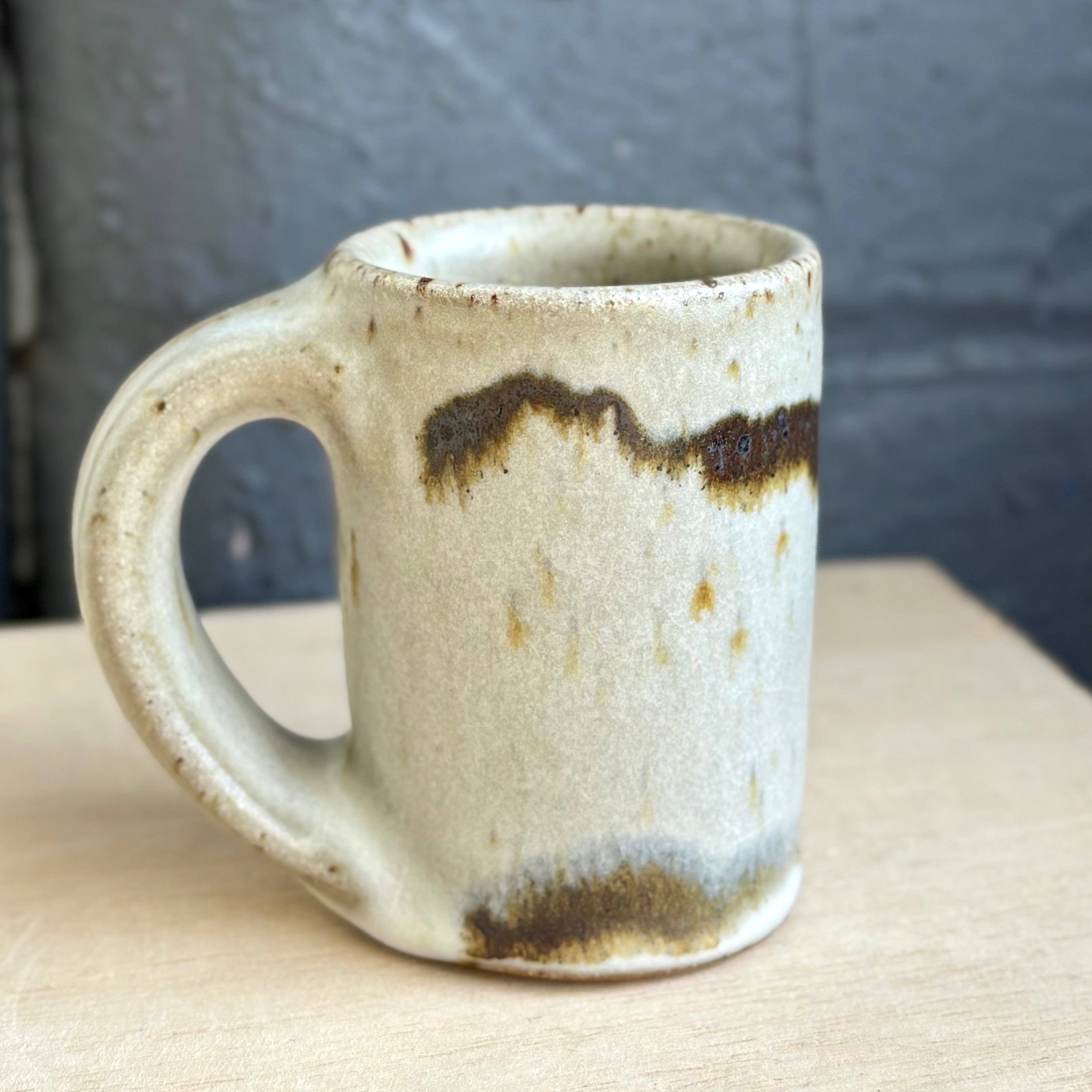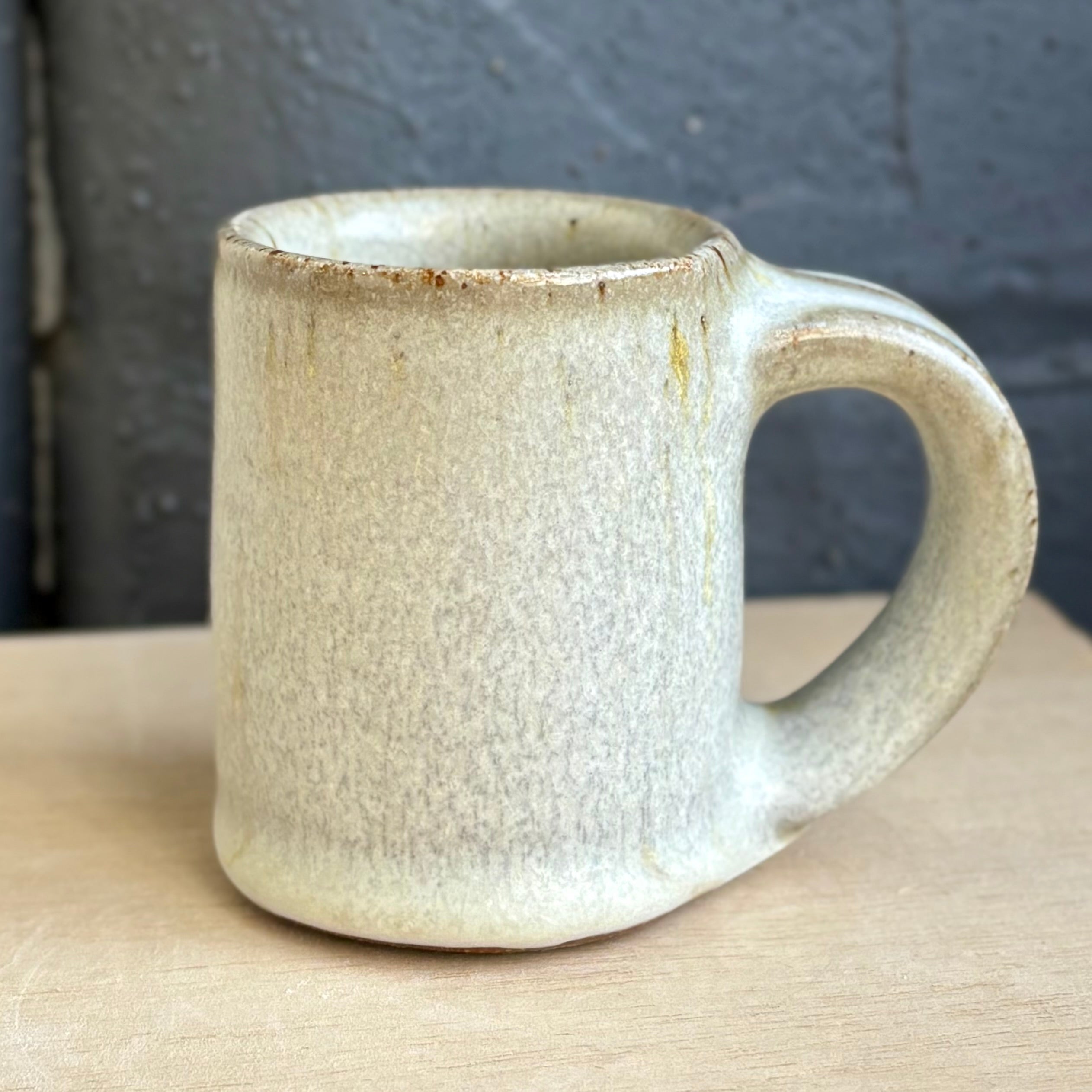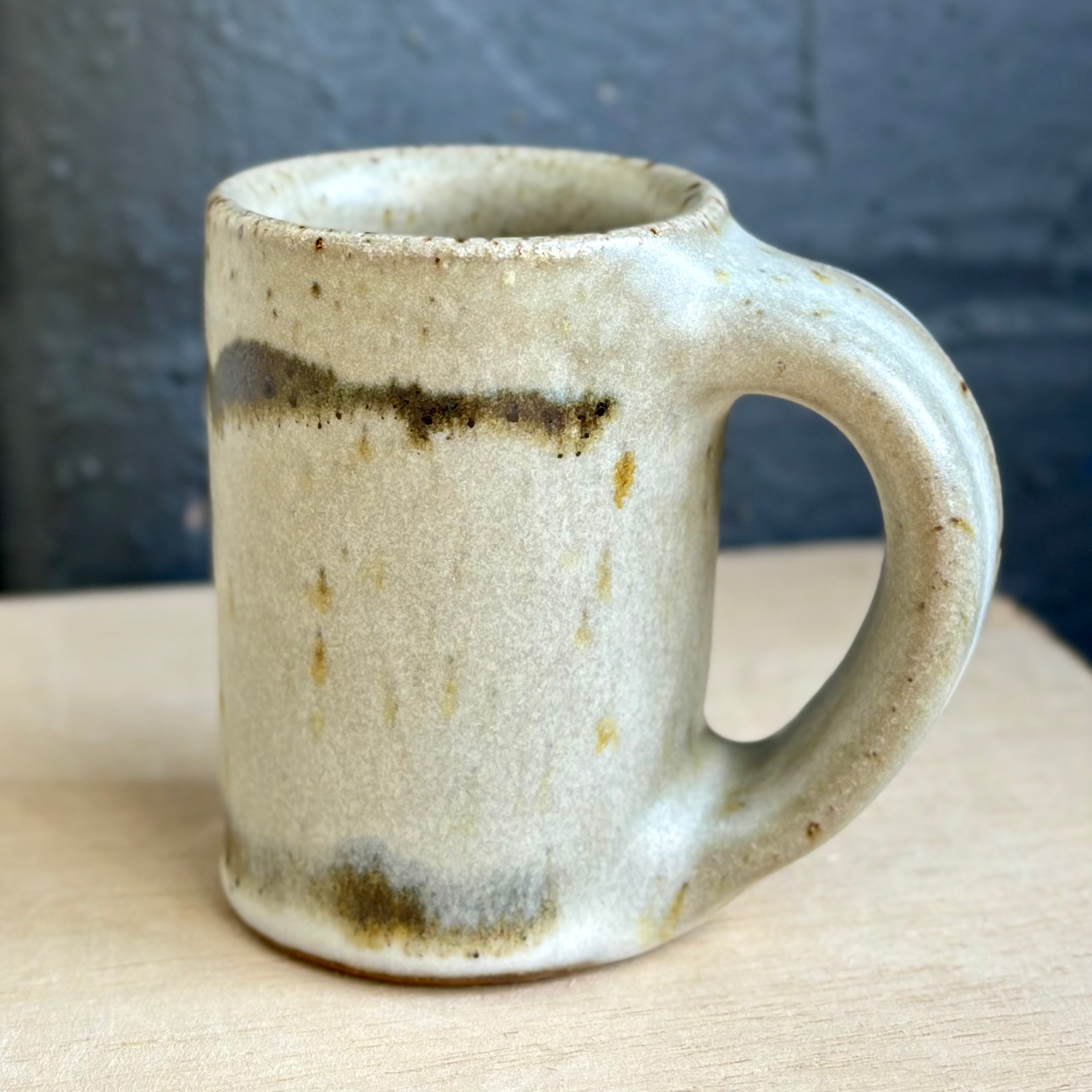 These slightly larger espresso cups by Josh Kopin are wheel-thrown and gas-fired, part of the warm and understated “Gold Drift” series. The surface features a soft cream glaze that breaks into earthy tones and golden blushes, varying beautifully from piece to piece. Comfortably weighted with a generous handle, they’re well-suited for a double shot of espresso or a small pour of coffee.