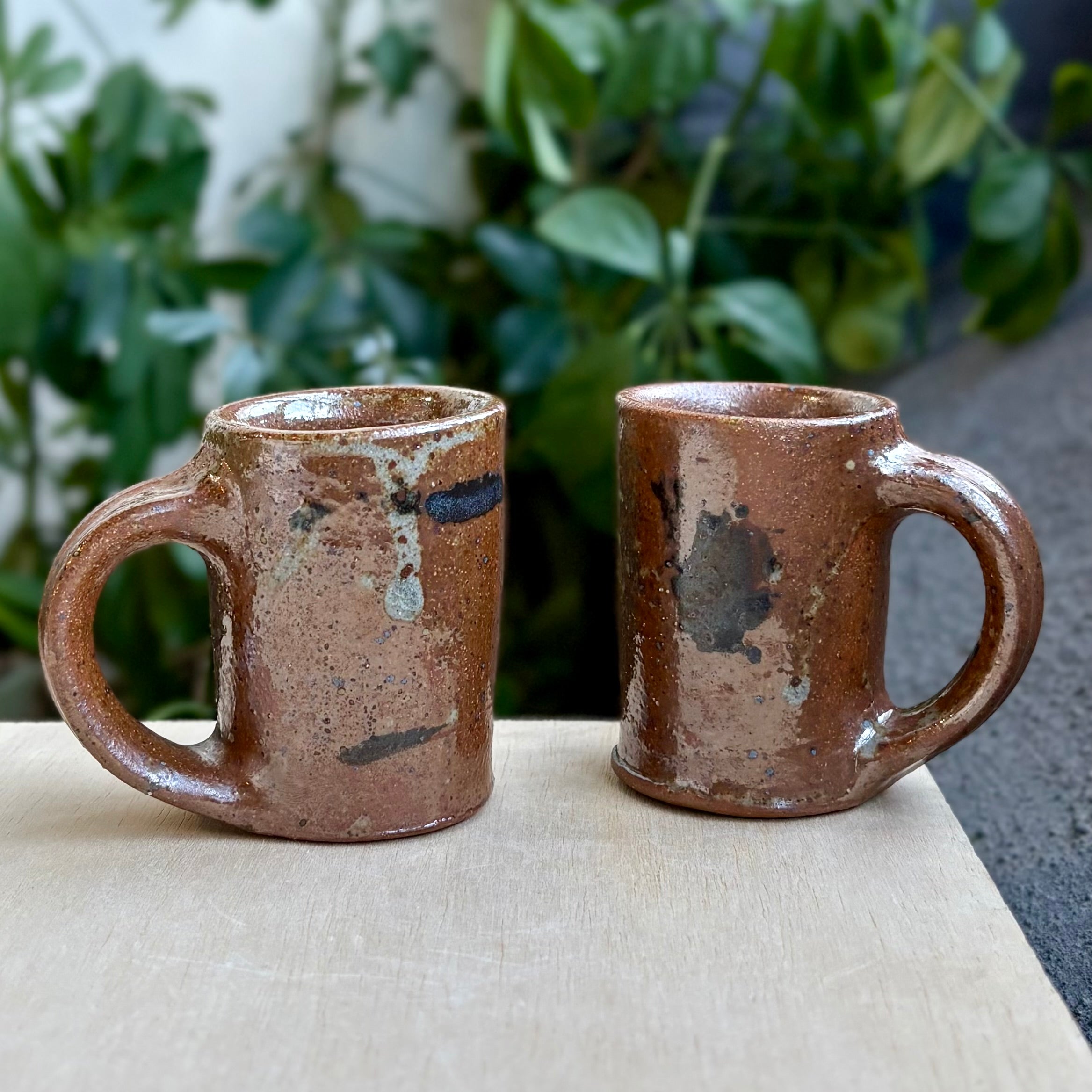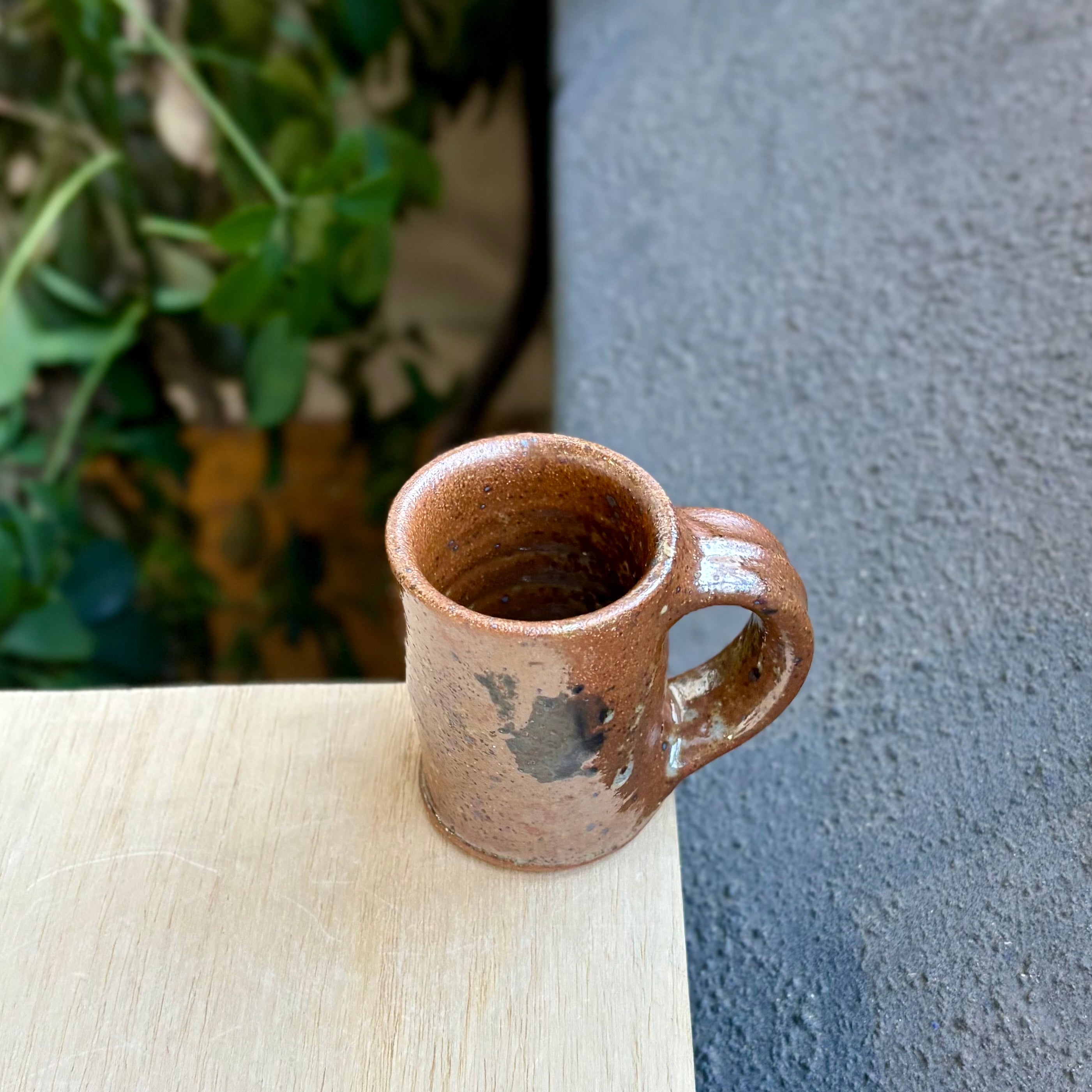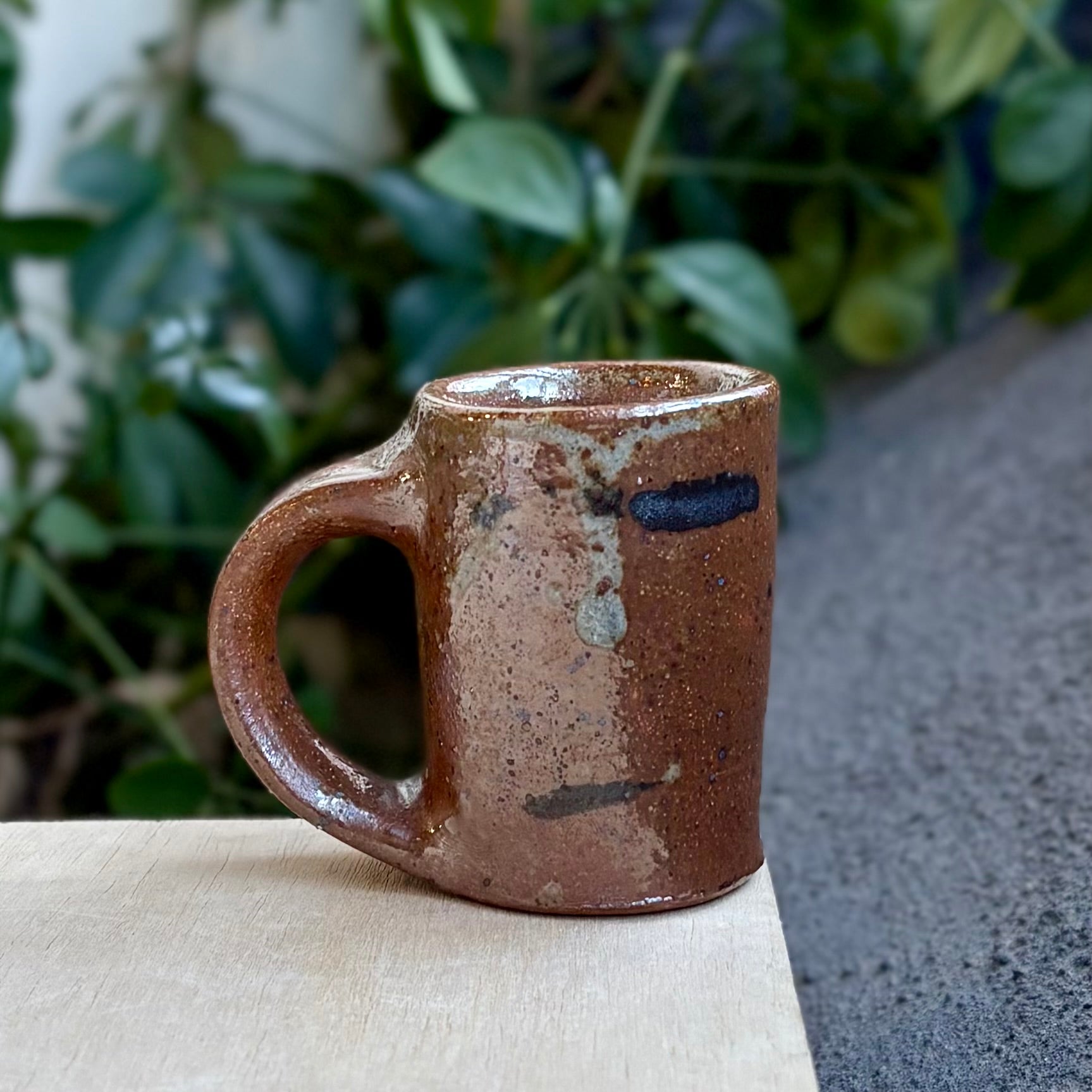 Josh Kopinによる轆轤成形のエスプレッソカップです。濃い色味の陶土を用い、ガス窯で焼成。木灰釉が柔らかな地の表情をつくり、その上に黒ドロマイト釉を刷毛で施すことで、静かな動きとコントラストが生まれています。釉薬の重なりや刷毛目には一点一点違いがあります。