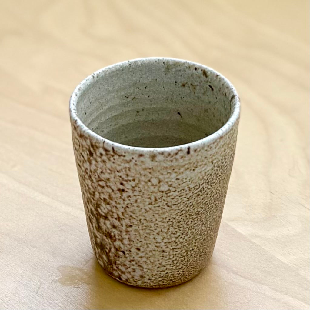 This yunomi by Josh Kopin is wheel-thrown from buff stoneware and wood fired. The unglazed exterior reveals the raw surface of the clay, bearing subtle ash deposits and flame markings that give each cup its own quiet topography. Inside, a soft shino glaze offers a smooth contrast—warm, pale, and functional. At 3 inches high and holding about 5 oz, it’s perfect for tea, espresso, or simply holding in the hand.
