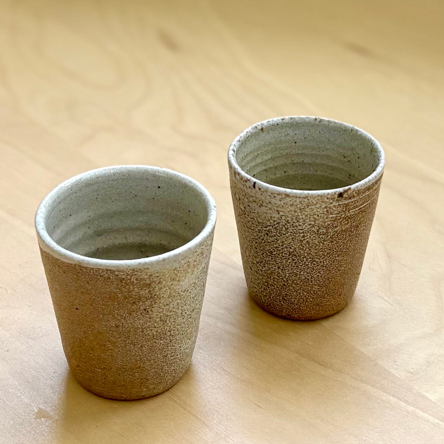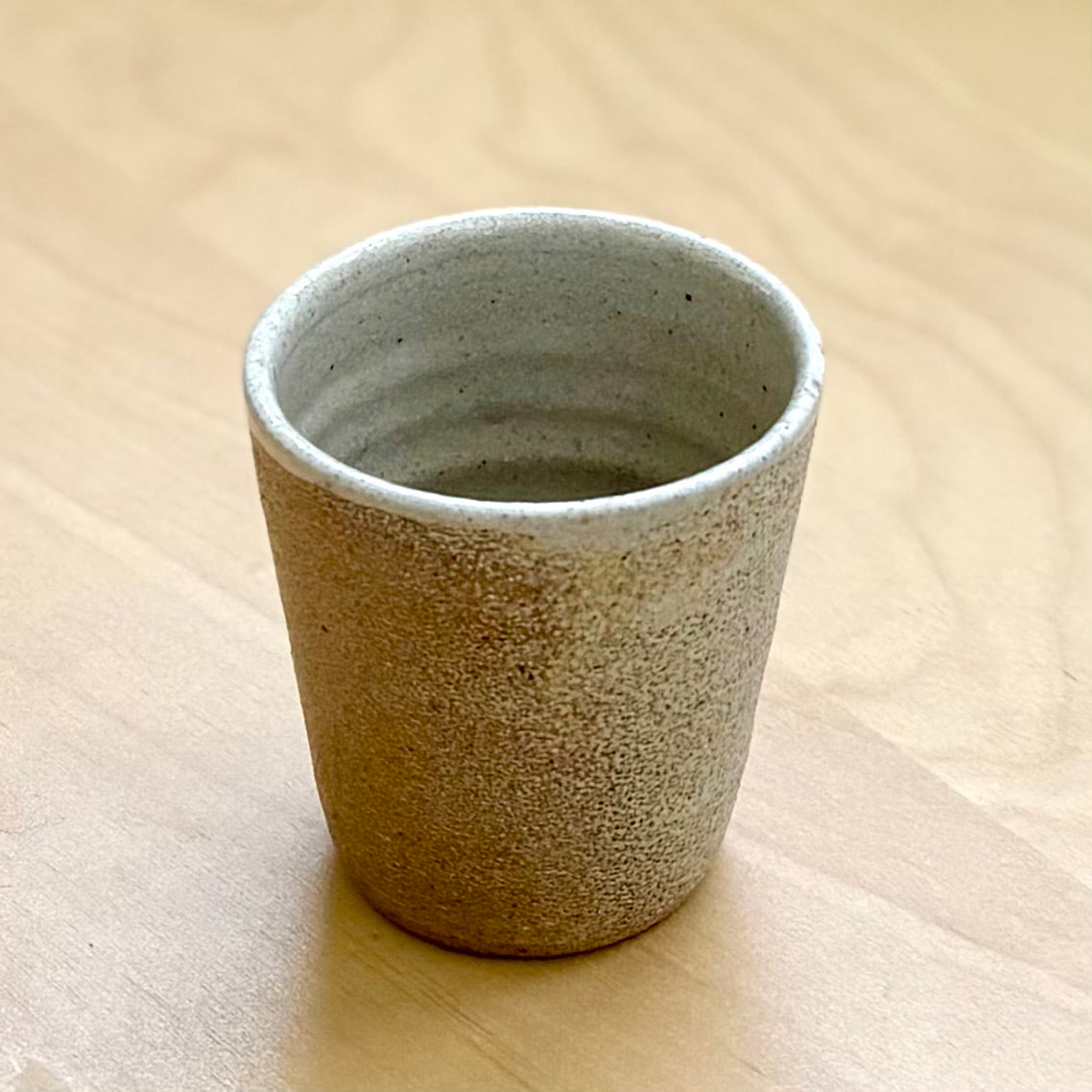 Josh Kopin による湯のみ。バフ色のストーンウェアを使い、薪窯で焼成されています。外側には釉薬をかけず、炎や灰の影響をそのままに受け止めた素地の表情が美しくあらわれています。内側には淡い志野釉が施され、手ざわりのやさしい対比を生み出しています。高さ約7.5cm、容量約150ml。お茶やエスプレッソ、小さな余白の時間にぴったりの器です。