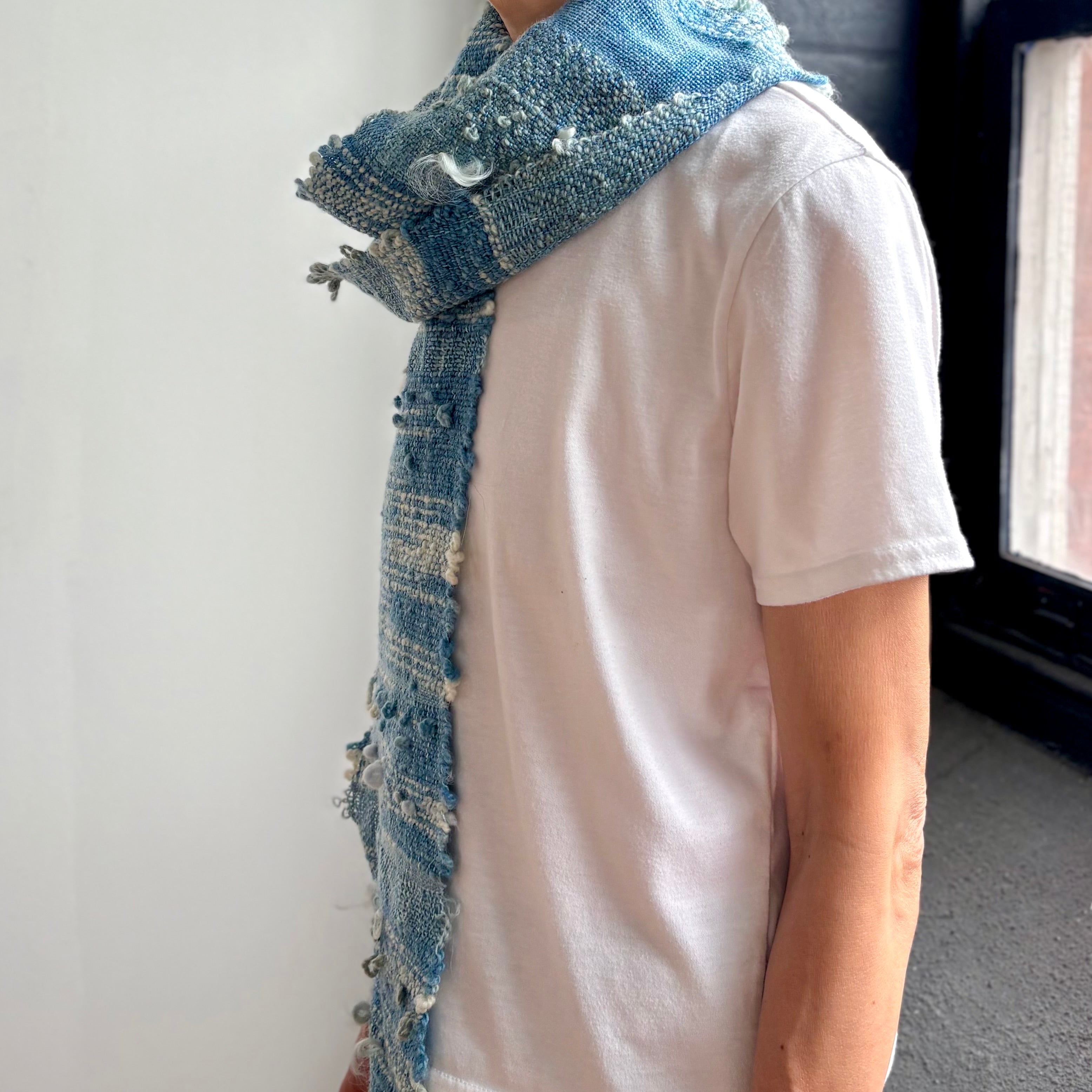 Improvisationally handwoven by fiber artist Mihoko Wakabayashi using cotton, wool, and alpaca, this singular scarf emerges from her award-winning “Seed to Fashion” project exploring natural fibers and dyes. Soft and richly textured, it features intuitive color transitions and a uniquely expressive rhythm that’s both wearable and one-of-a-kind. A warm companion for cool days—or an accent of joyful individuality in any season.