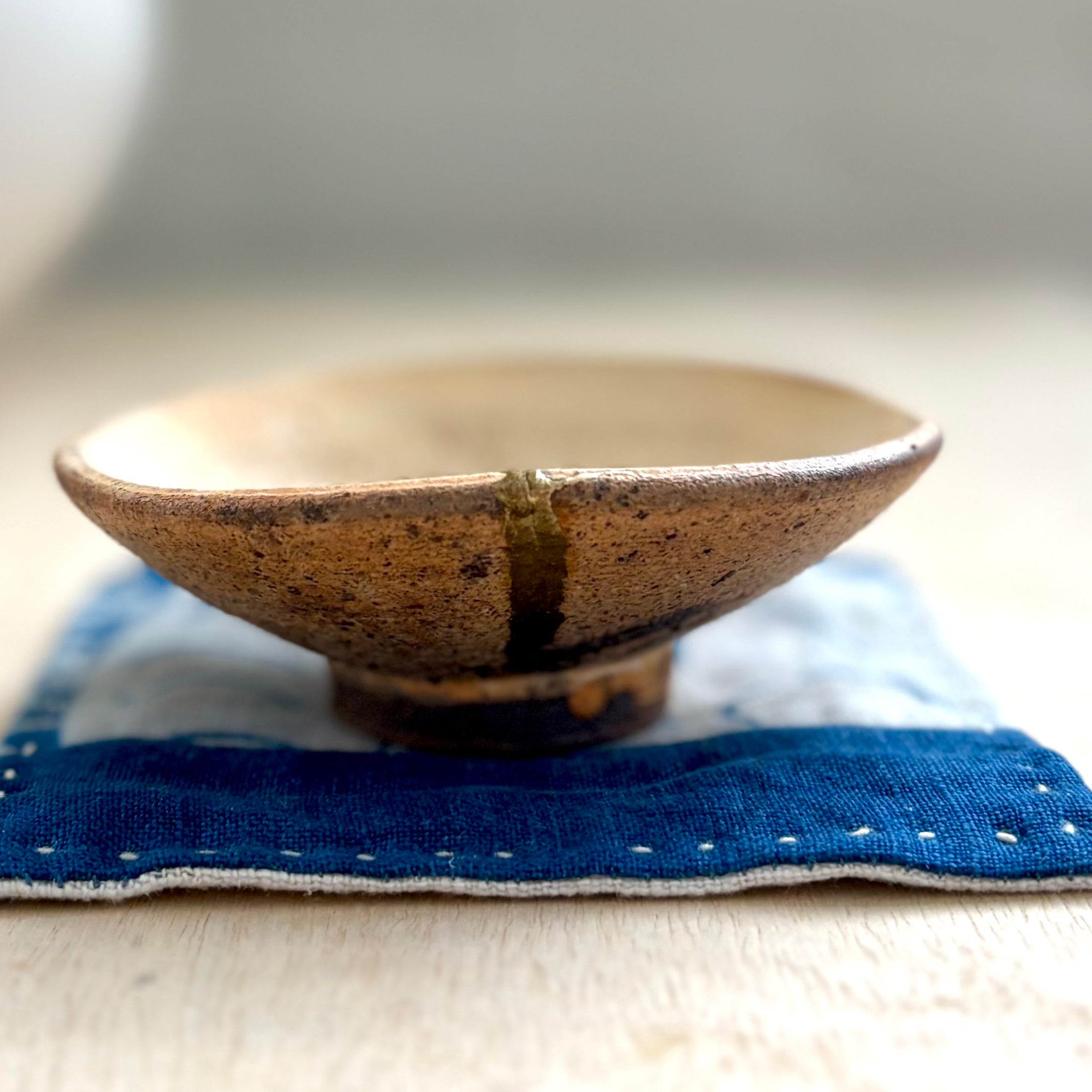Shallow and gently open, the plate is well suited for serving small bites, condiments, or tea sweets, and also works beautifully as a resting place for everyday objects. Measuring approximately 1.5” high and 4” in diameter, it remains fully functional while carrying its own mended story. Food safe, microwave safe, and dishwasher safe.
