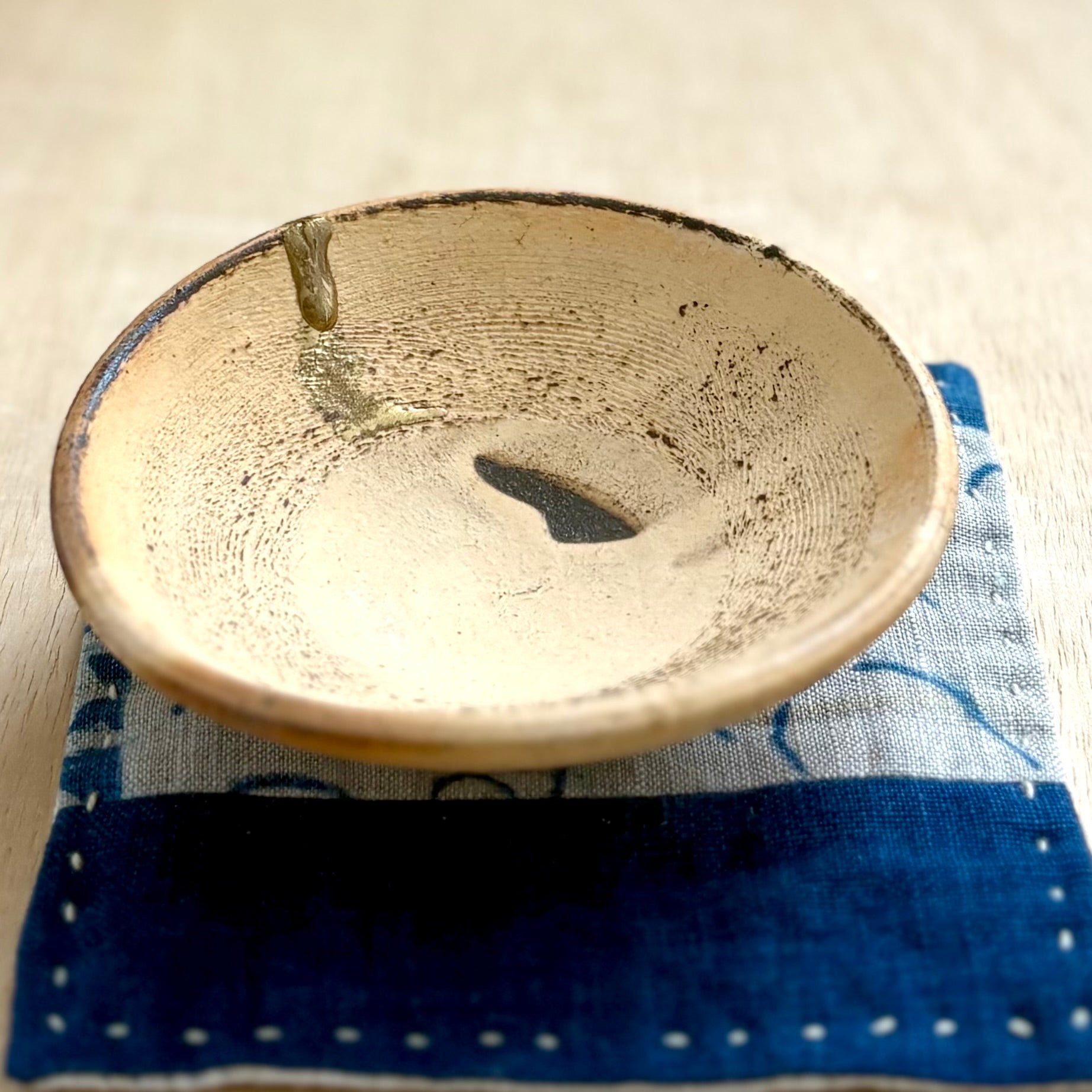 バーモント州の陶芸家 Silene DeCiucies による薪窯焼成のストーンウェア小皿。カオリンの化粧土を施した表面には、薪窯の炎と灰の作用によって柔らかな表情が生まれています。本作品は輸送中に小さな破損が生じたため、亜麻仁樹脂と金属雲母を用いた現代的な金継ぎ風の技法により、店内で修復されました。縁から縦に走る金色の継ぎ目はあえて見せる仕上げとなっており、器のかたちを尊重しながら、その歩んだ時間を静かに刻んでいます。