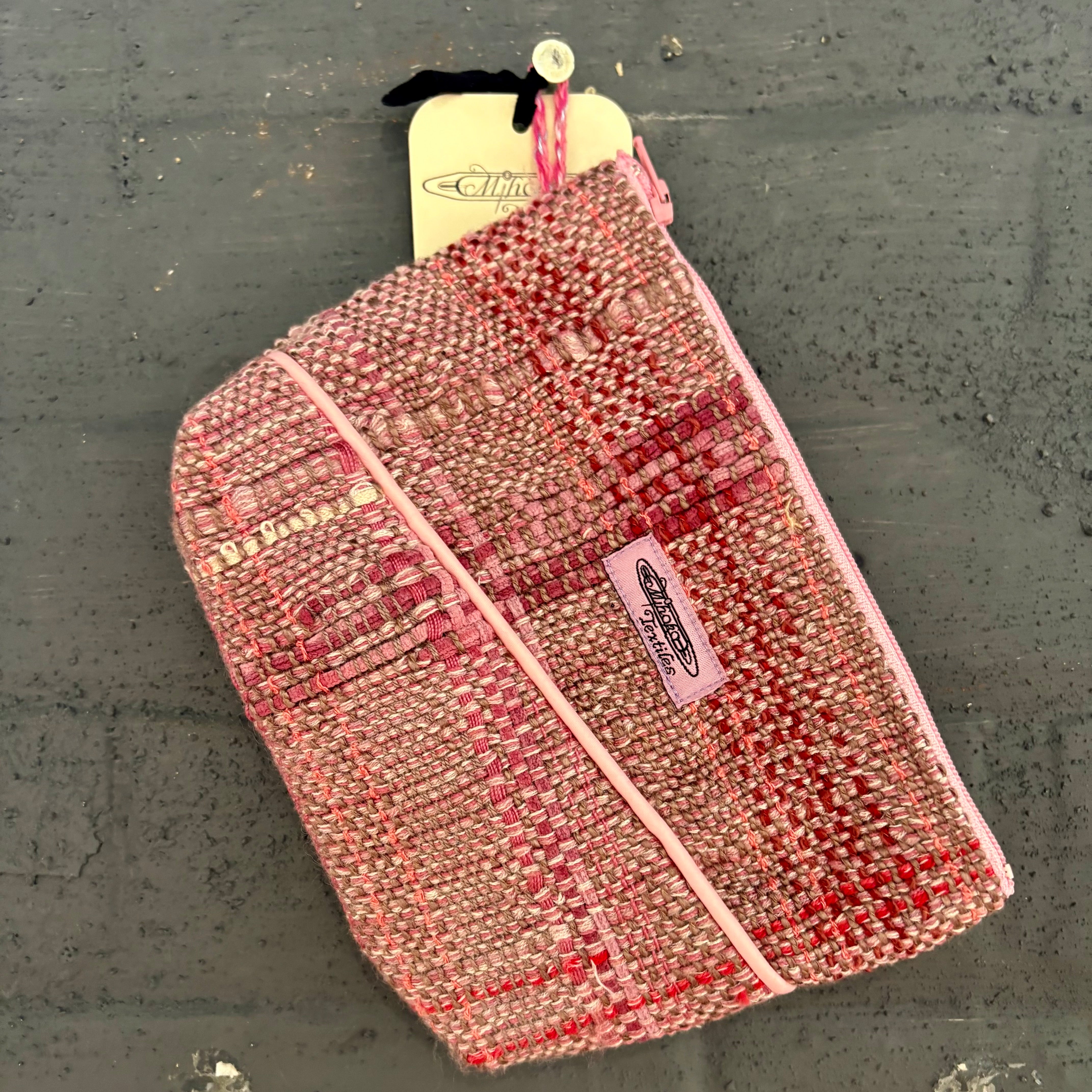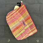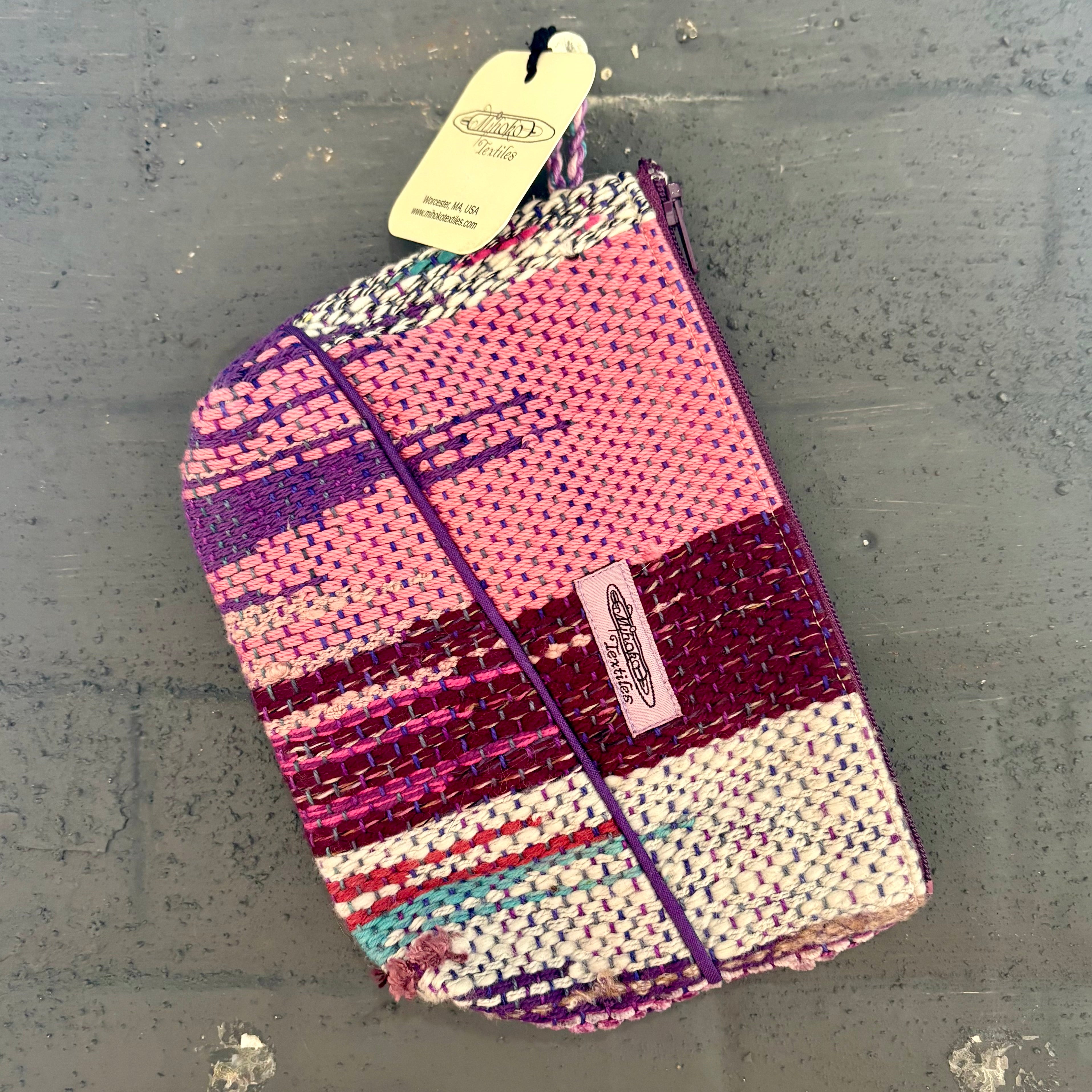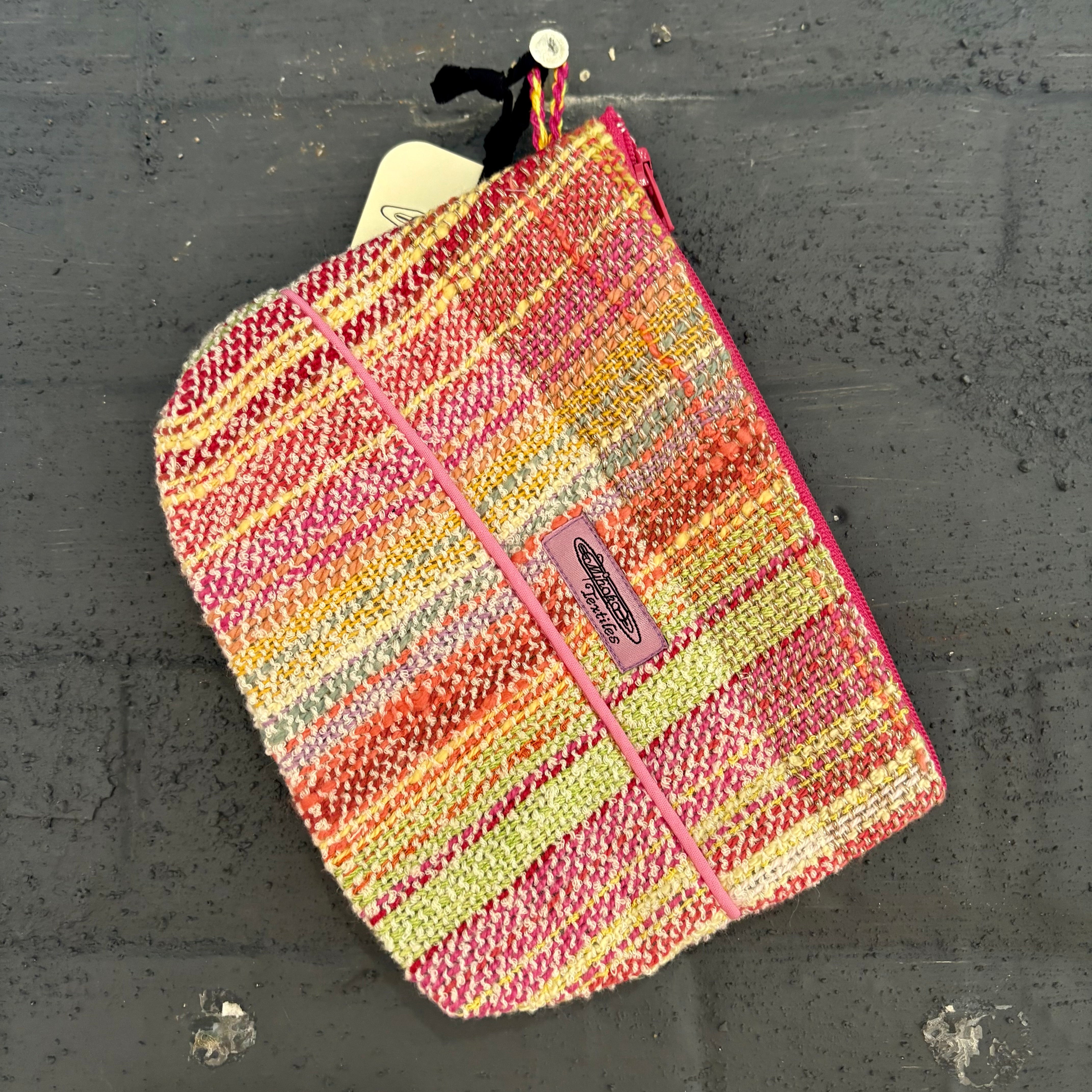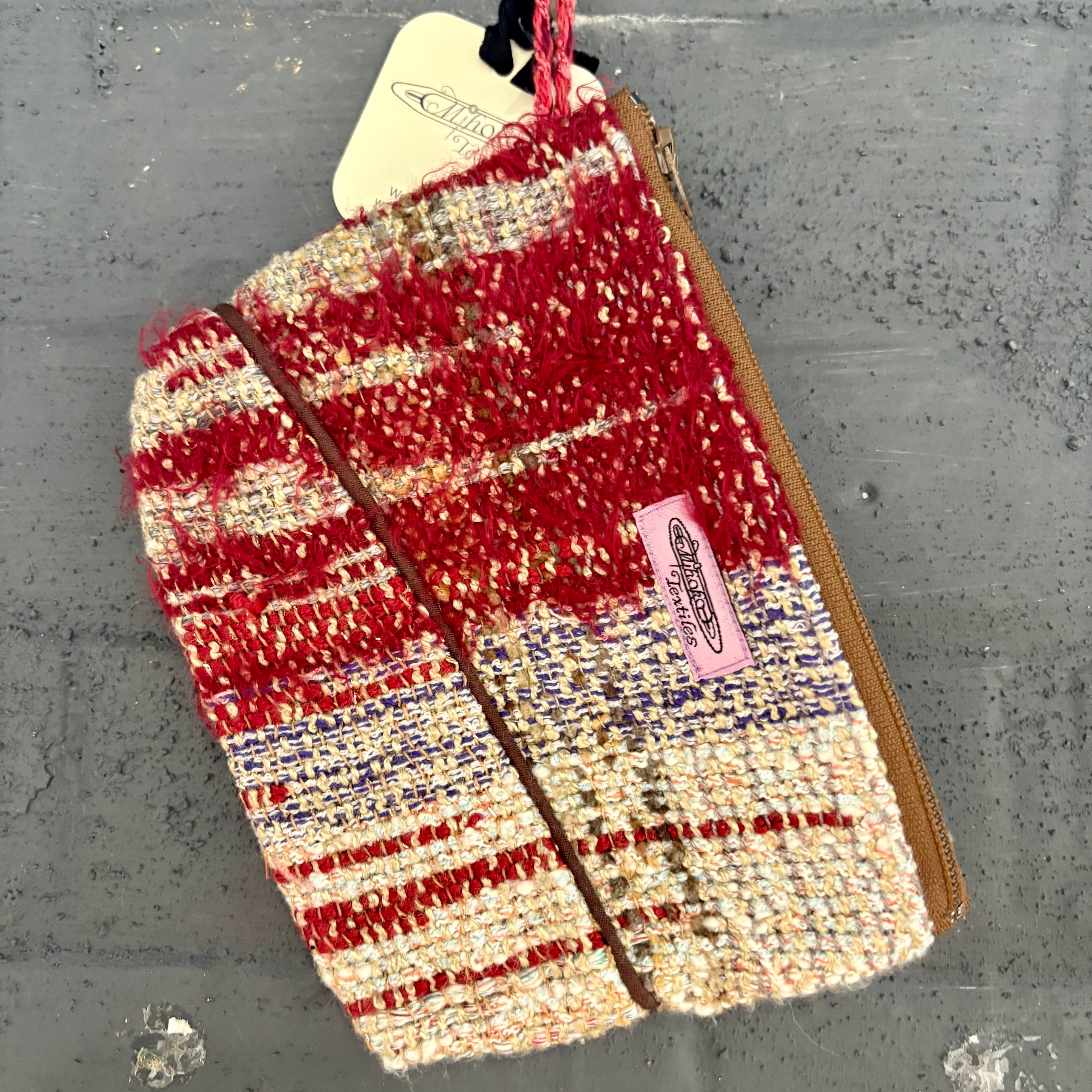 繊維作家・Mihoko Wakabayashiによって即興的に手織りされた一点物のラージポーチ。鮮やかな色彩と機能美が心地よく調和し、天然繊維や混紡糸が織りなす質感と色合いの響き合いが魅力です。裏地付きで、しっかりとしたファスナー仕上げ。旅のお供やペンケース、日常使いの小物入れとしても最適です。