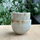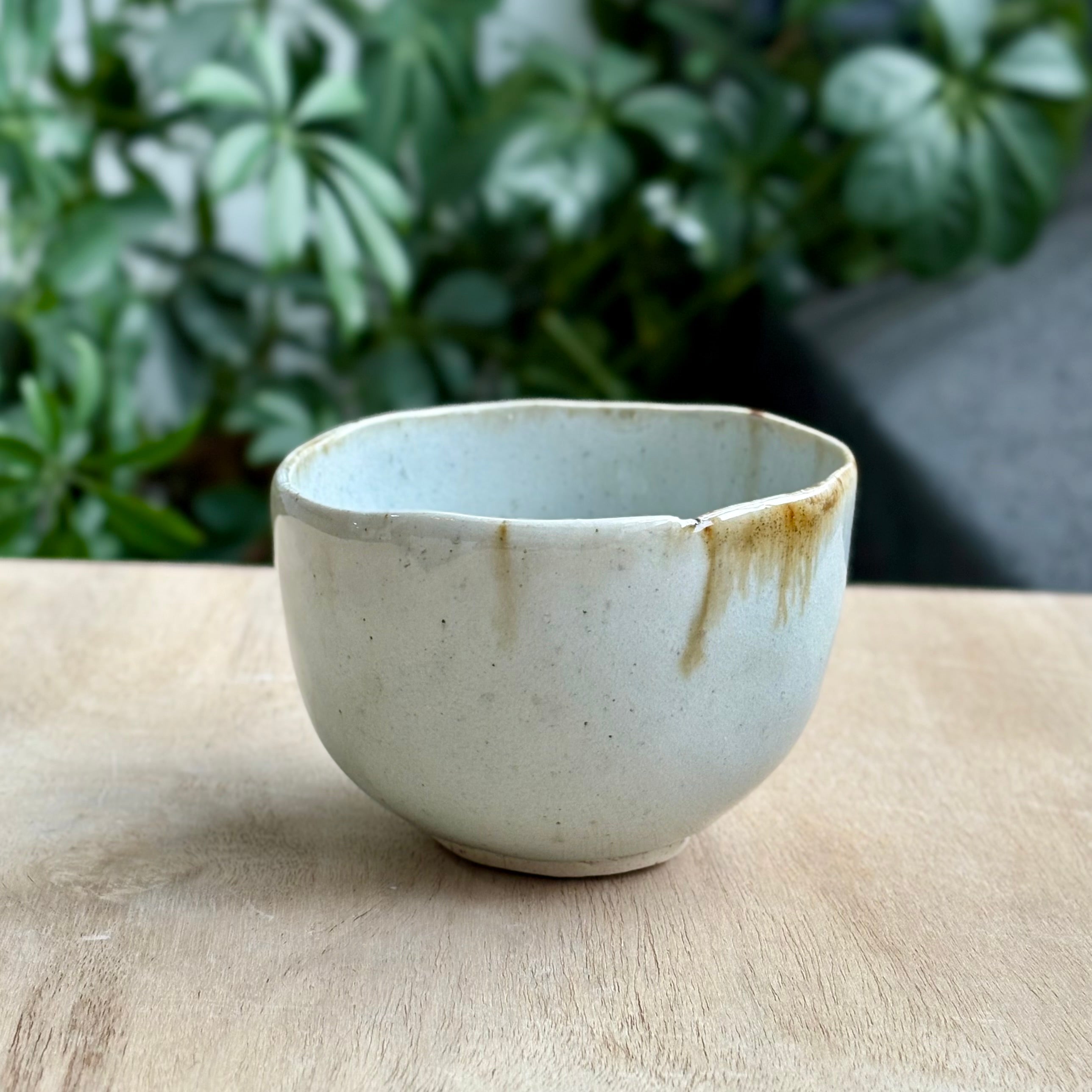 Andy Vlockによるこの小鉢は、磁器で成形され、灰釉を施してガス窯で焼成されています。焼成によって生まれる柔らかな色調の揺らぎと質感が、静かで落ち着いた佇まいを生み出しています。手に収まりのよい丸みのある形で、日常の取り鉢や果物、菓子用としてはもちろん、小ぶりの抹茶碗や湯のみとしても美しくお使いいただけます。