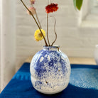 This vase by Andy Vlock is formed from rich red clay and gas-fired, giving the surface a deep, earthy warmth. A soft dolomite glaze pools and breaks across the form, animated by a spontaneous cobalt splash that adds movement and quiet tension. The glaze responds subtly to the firing, revealing variation in tone and texture that rewards close looking. Elegant yet grounded, this vase works beautifully as a focal object on its own or holding a single stem or small branch.