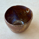 The form is compact and gently rounded, with an uneven rim that adds visual interest while remaining comfortable to drink from. Inside, the glaze deepens in tone and texture, offering a sense of depth and quiet movement. The exterior surface is subtly textured and inviting to the hand, balancing visual complexity with a grounded, everyday usability.