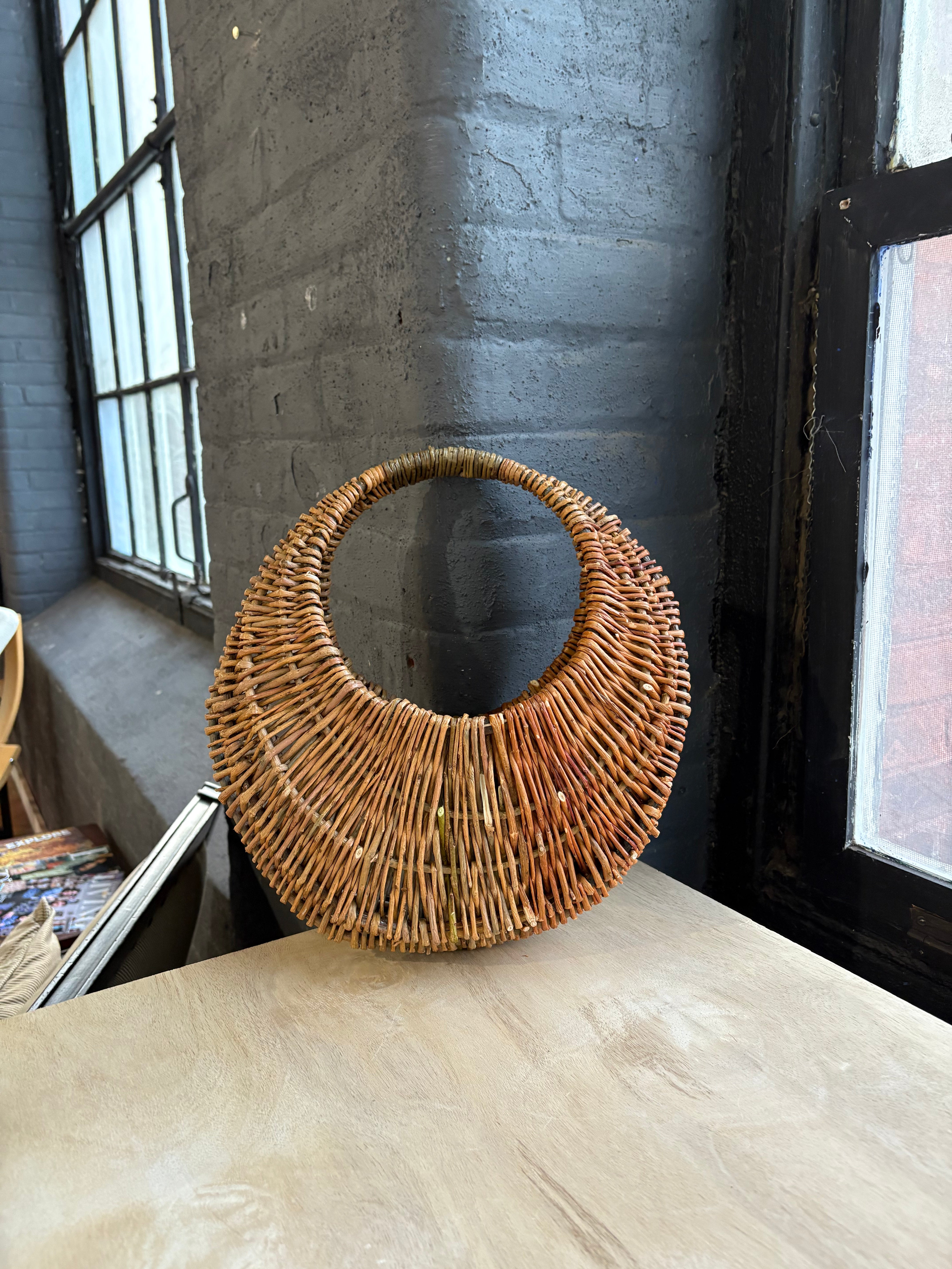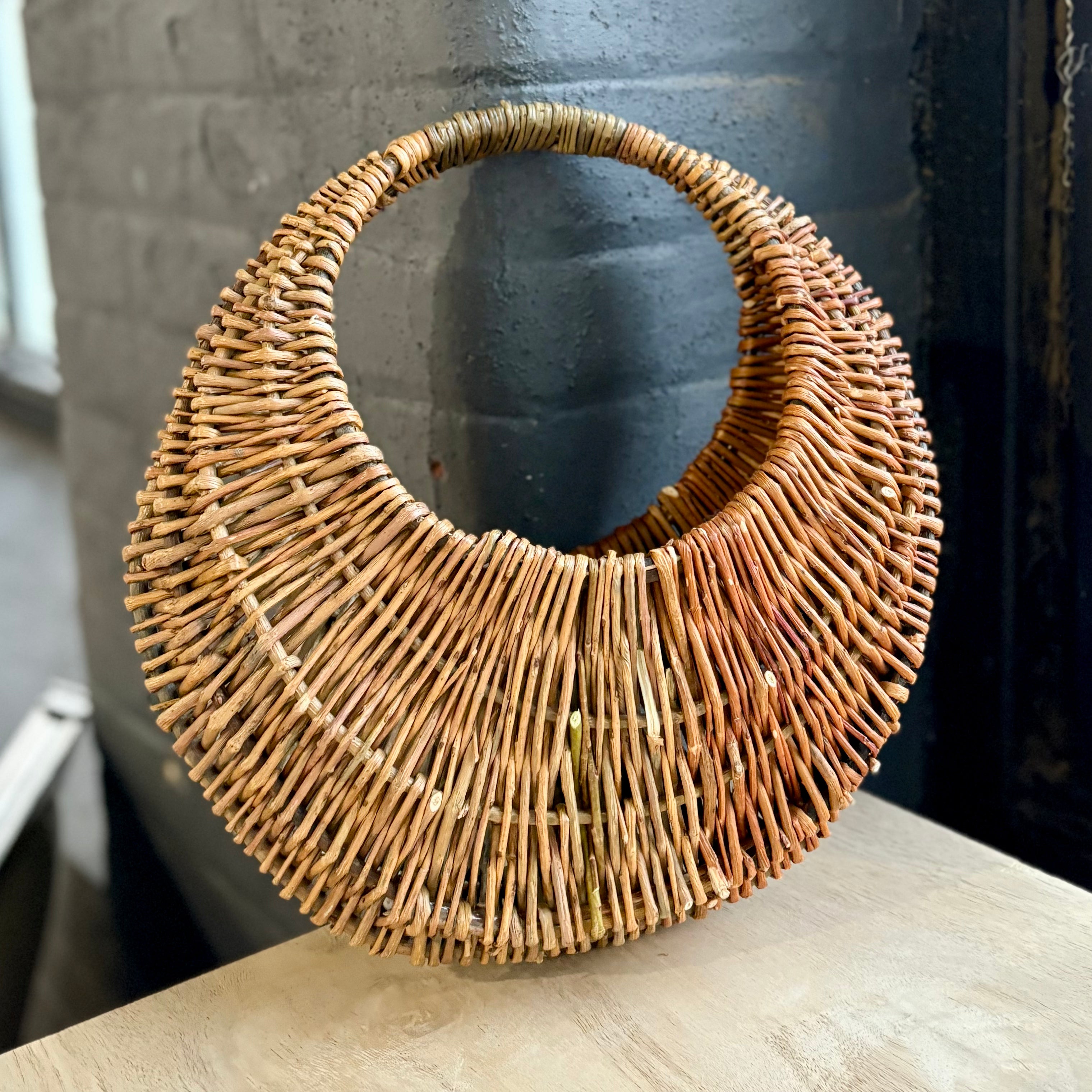 Hand-woven by Kokoro Bensenoff, this sculptural willow handbag carries the quiet strength and warmth of natural materials. Its crescent form is both functional and expressive—wide enough for daily essentials, yet light in the hand. The circular handle fits comfortably on the arm or can be carried at your side, making it a beautiful companion for unhurried days, weekend markets, or simple walks across town.
